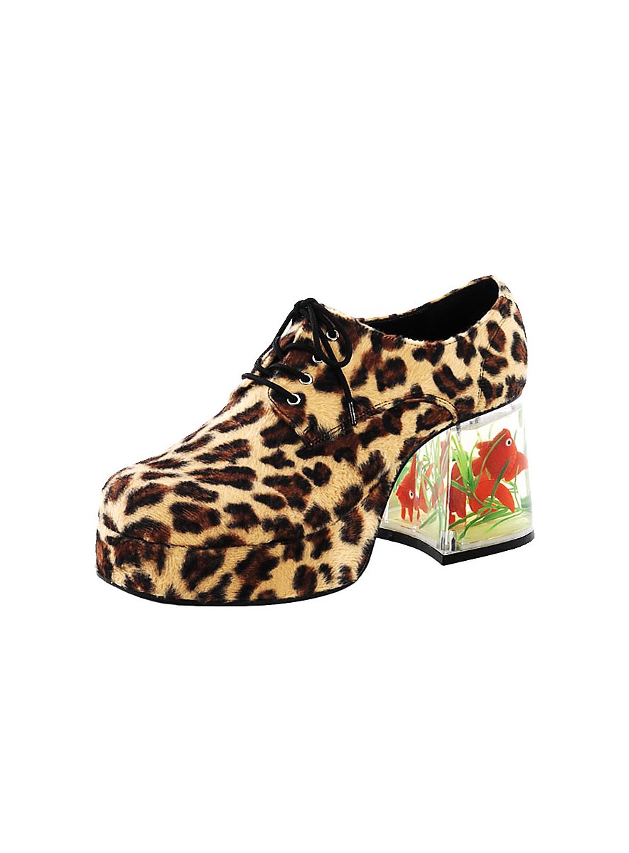 Disse 70'erne herresko med kunstpels i leopard-look har en sålehøjde på ca. 3,3 cm, hælen ligner et lille guldfisk-akvarium og er bagpå ca. 9 cm høj. 70'erne sko herrer leopard bindes med sorte snørebånd, der føres gennem metal-øjer.