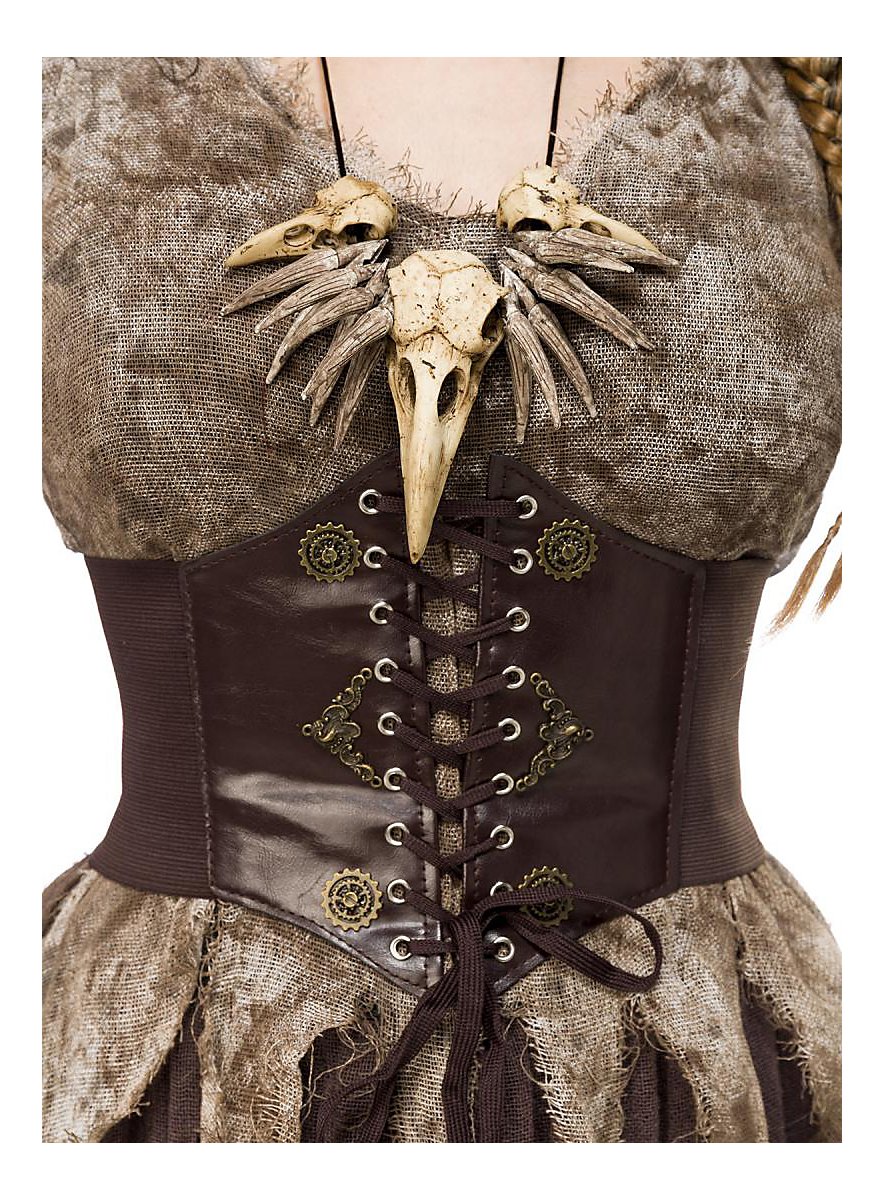• med hovedpynt, kæde, bælte, handske med bånd, overdel og nederdel