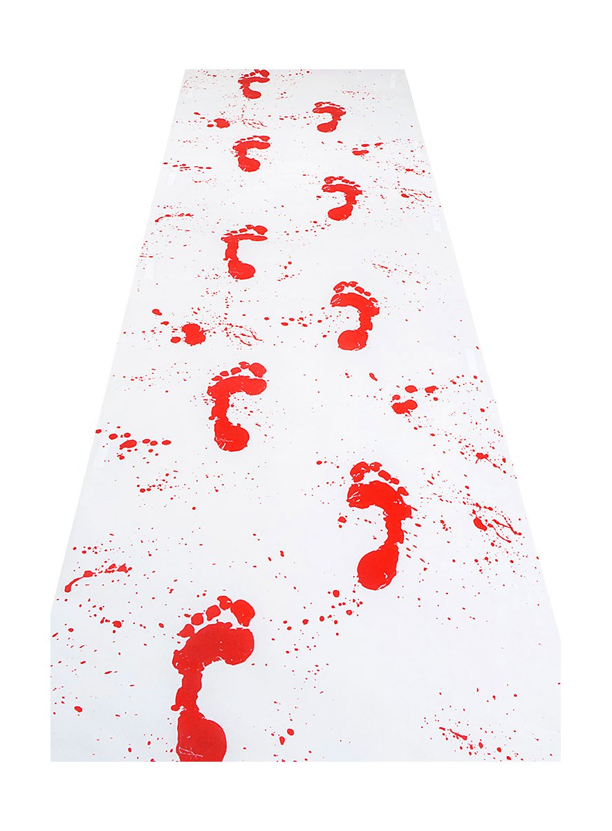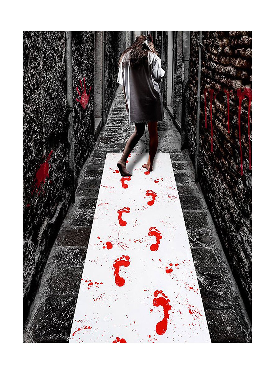 • med blodige fodaftryk og blodstænk