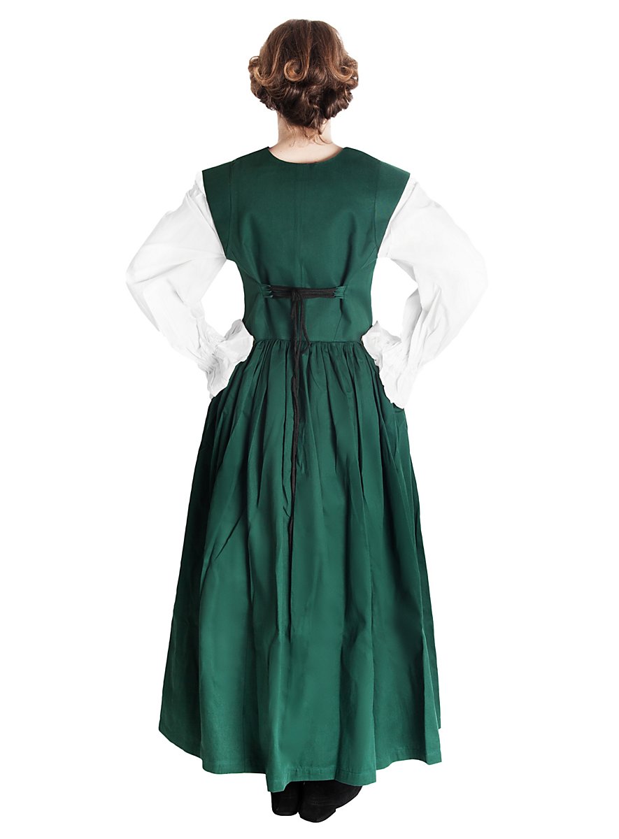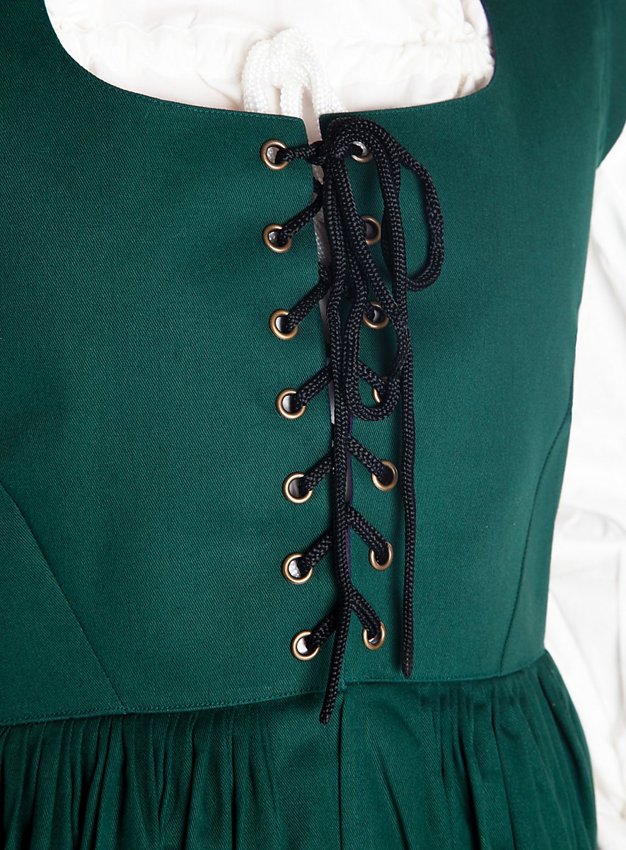 Sådan et liv som bondekone er virkelig hårdt: hele dagen arbejde på marken og i køkkenet og ind imellem til markedet. Der skal man have en robust kjole, som ikke kun lever op til hverdagens høje krav, men som også er flatterende. Ligesom vores bondekjole for eksempel. Den slidstærke kjole i fast bomuld er åben foran over hele længden og kan derfor kun bæres over en chemise eller andet underkjole. Den ærmeløse kjole er lukket højt bagpå, men sparer ikke på et generøst udskæring. Bystieret i fast, forstærket stof er foret med et kontrastfarvet for. Foran tilpasses det individuelt til kropsformen ved hjælp af snor og metal-øjer, og bagpå er der også mulighed for at snøre kjolen strammere. Længdeabnåhere slanker taljen, under hvilken den gulvlange bondekjole falder løst til gulvet i lette folder.