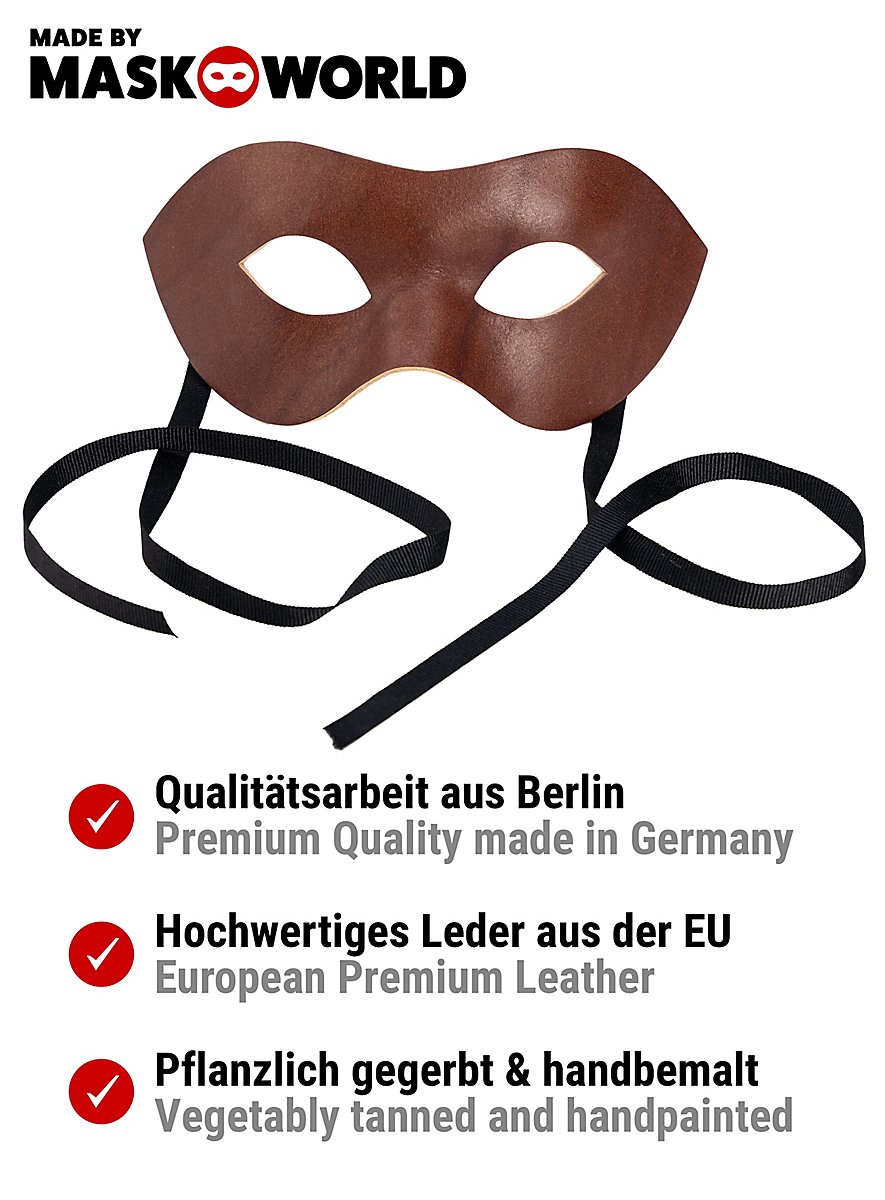 De mystiske lædermasker, udtryk for sanselig og poesi, blev oprindeligt fremstillet i Venedig som teatermasker til scenen og er i dag et forførende tilbehør til fortryllende kostumer. Det smidige, bøjelige læder er det autentiske materiale fra den tid og nyder stadig stor popularitet i dag. Det tilpasser sig perfekt til bærerens ansigt, lader huden ånde og kan derfor bæres behageligt og komfortabelt i flere timer - ideelt til en sceneopførelse eller en festlig balnat.