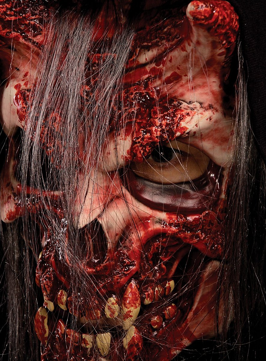 I princippet lyder "uhyre" næsten stadig for harmløst for denne grove djævlemaske, hvor den klassiske kombination af skorpet blod og knogler sørger for dybtgående gåsehud-anfald. Fordi halvmasken af latex endda er indarbejdet med nogle grå hårstrå i hovedbeklædningen af sort stof, virker hele udseendet endnu lidt mere ægte. De plastisk modellerede horn, tænder og andre knogler, men også blodskorpen bidrager til det uhyggelige ansigt. Elastiske bånd holder djævlemasken uhyre fast på baghovedet, mundåbningen tillader fødeindtagelse - selv med masken på!
