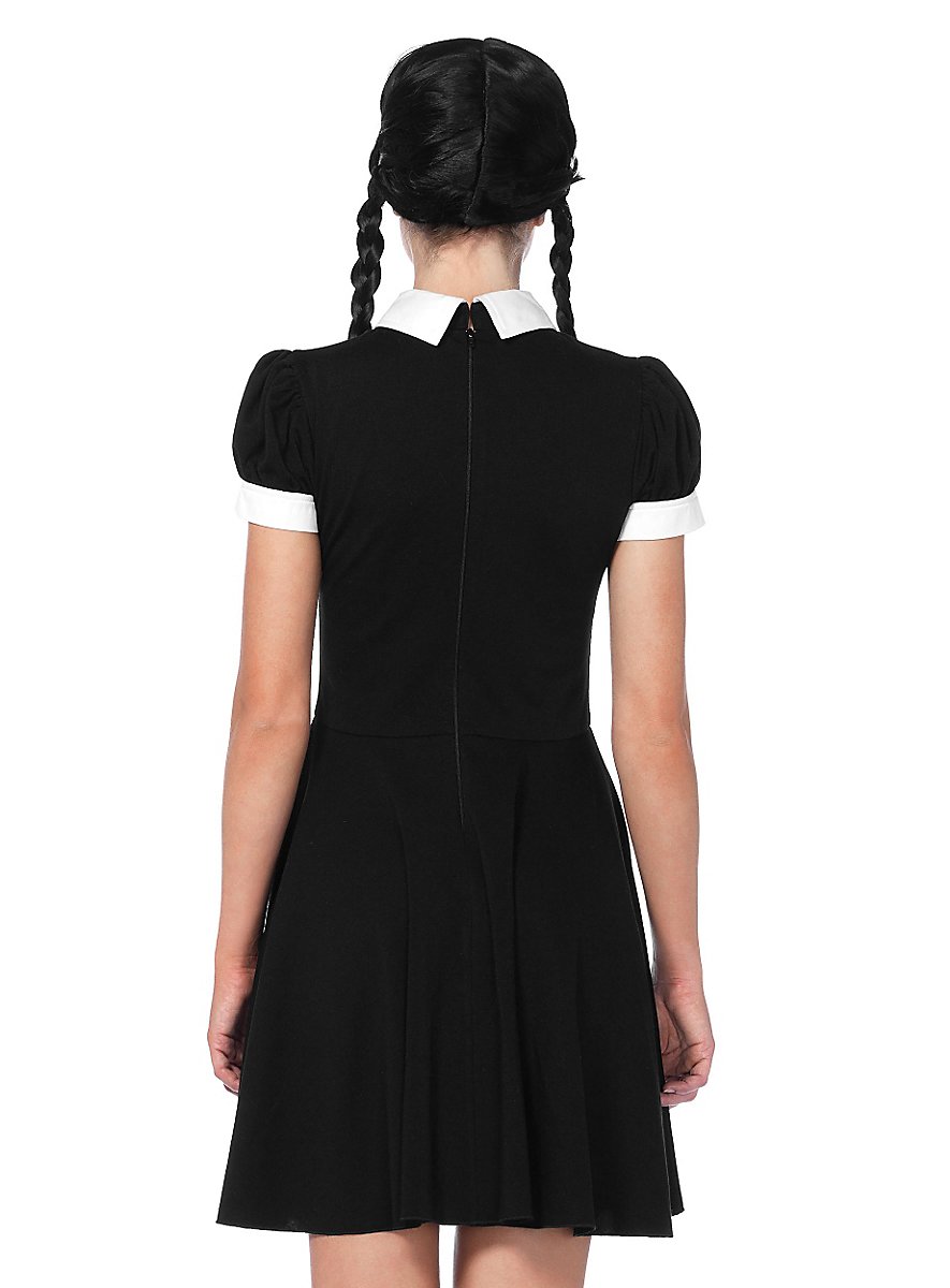 Gothic skolepige kostumet består af en sort minikjole med hvid krave og ærmeender samt en sort fletteparyk. I dette ærbare og samtidig sexede kostume kan den næste fastelavn- og Halloween-fest komme!