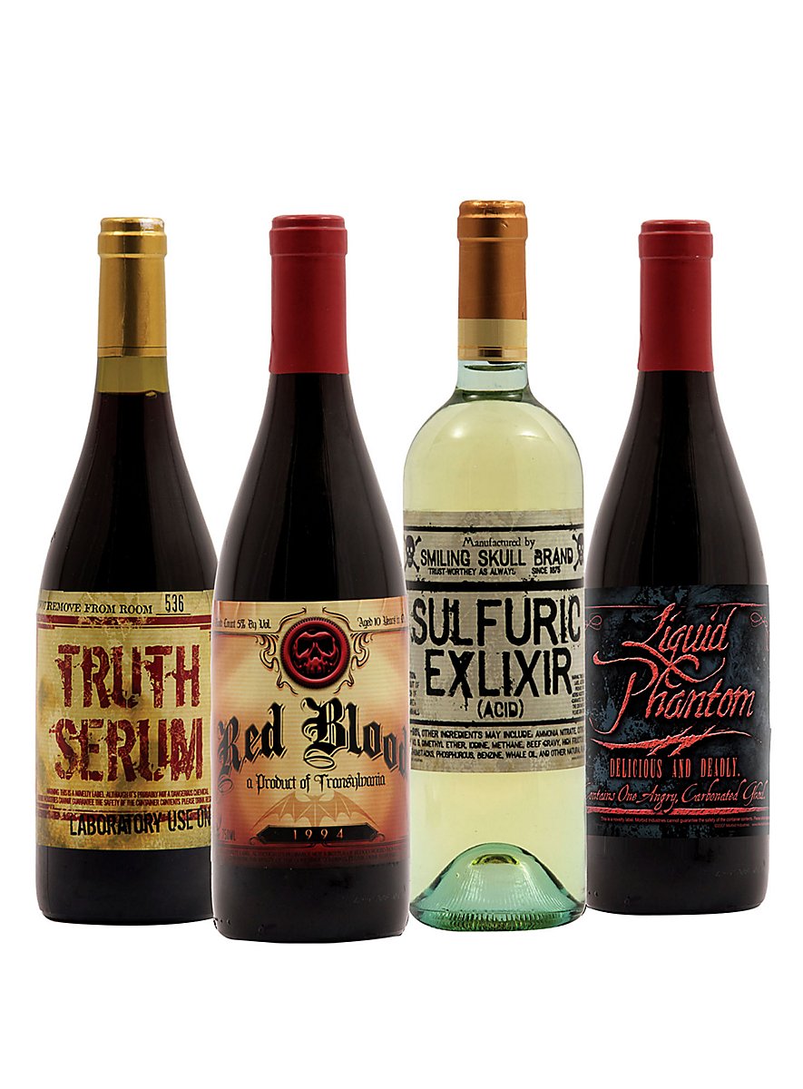Realistiske flaskeetiketter til påklæbning på jeres vinflasker. Original dekorationsidé til Halloween og gyserfest.