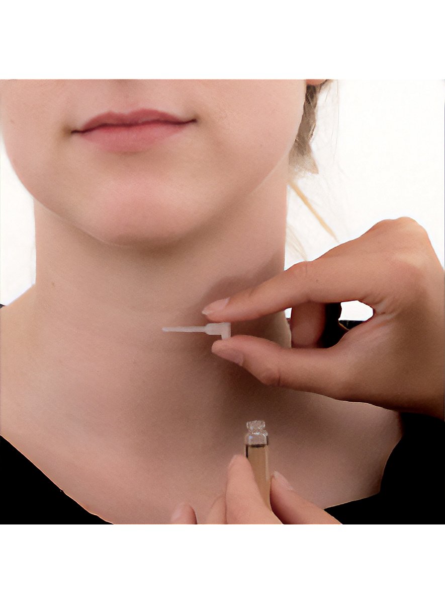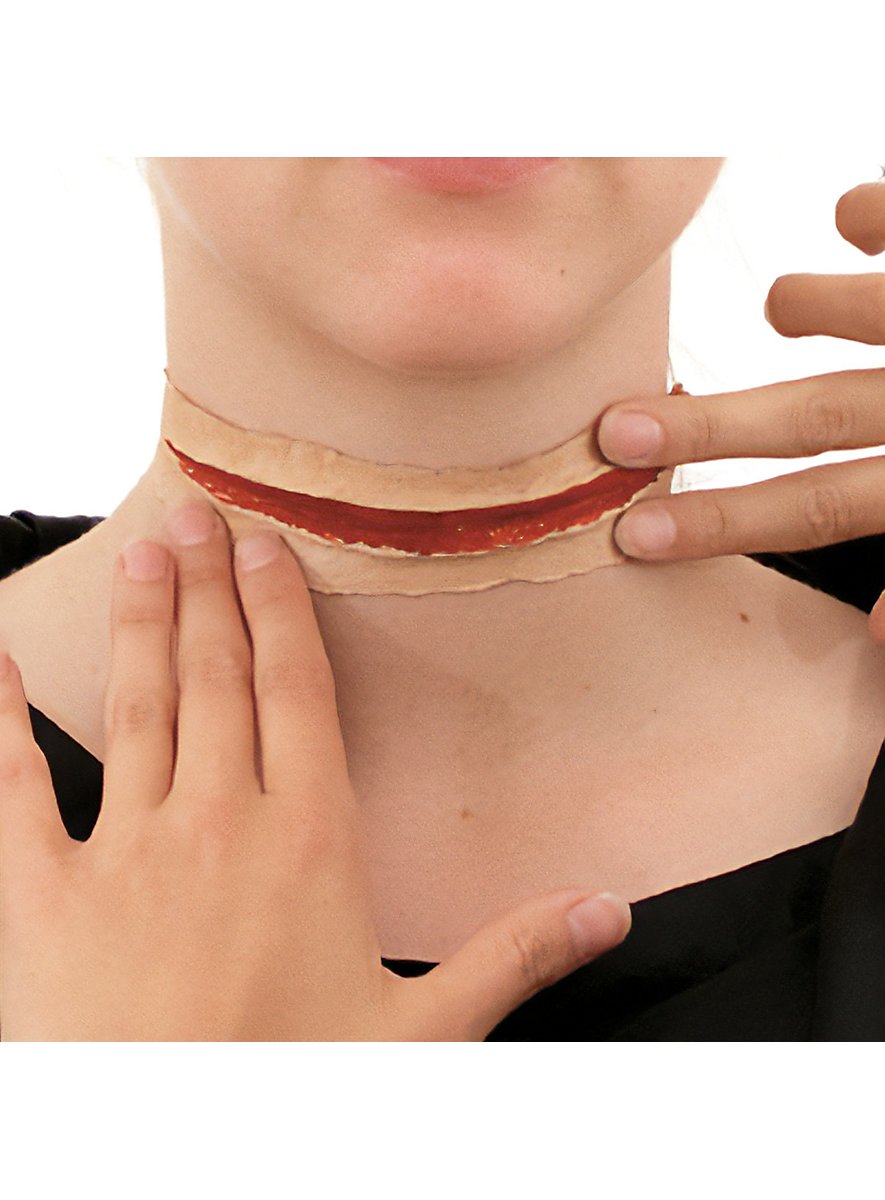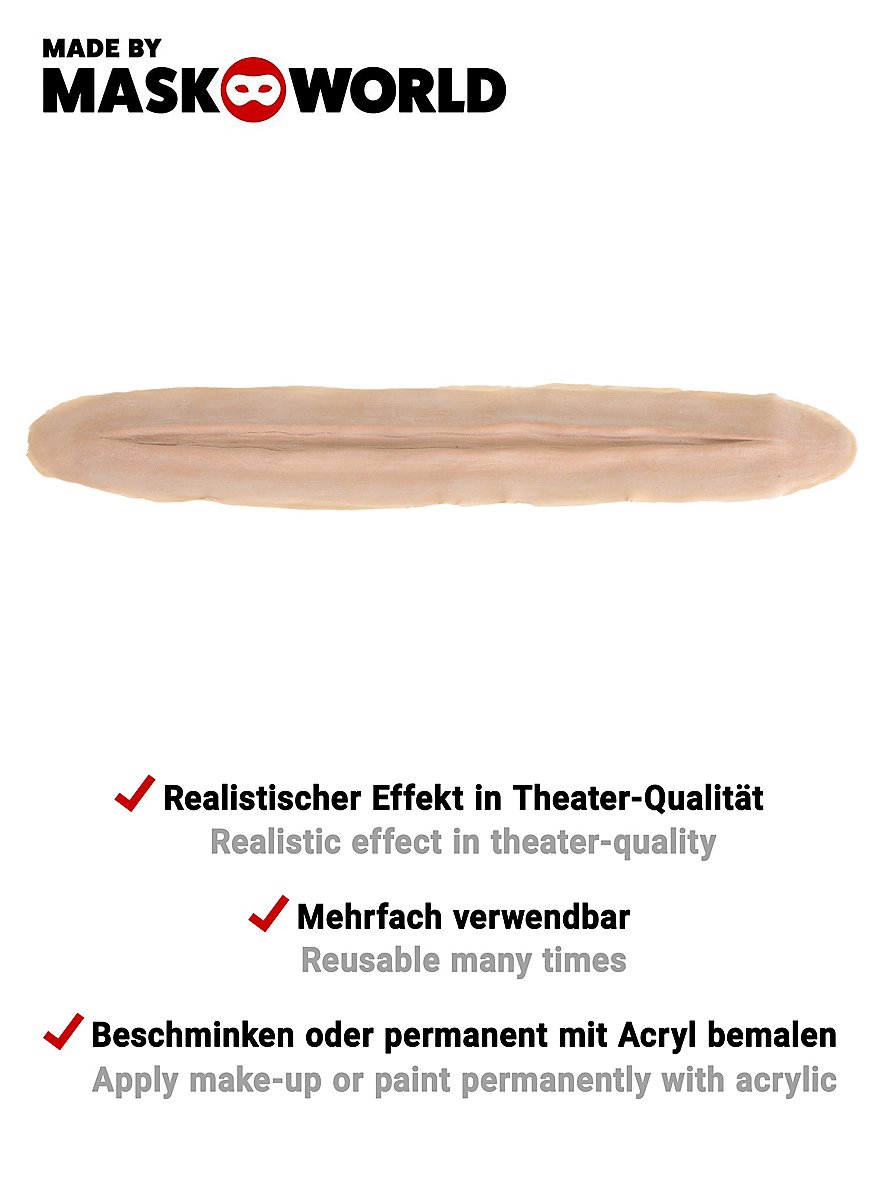 Med dette professionelle halsskæring latexsår kan du nemt og hurtigt forvandle dig til et offer for Jack the Ripper eller en anden karakter fra din fantasi. Som alle MASKWORLD produkter er dette halsskæring sår også underlagt de strengeste kvalitetskontroller for at leve op til kravene om et professionelt forvandlingsresultat. Alle MASKWORLD latex-applikationer er håndlavede. Latex udmærker sig ved sin ekstreme elasticitet og holdbarhed. På grund af denne egenskab tilbyder applikationerne også ved hyppig brug høj bærekomfort og en særligt realistisk effekt. Mastix lim udmærker sig ved fremragende klæbekraft og optimal hudkompatibilitet.