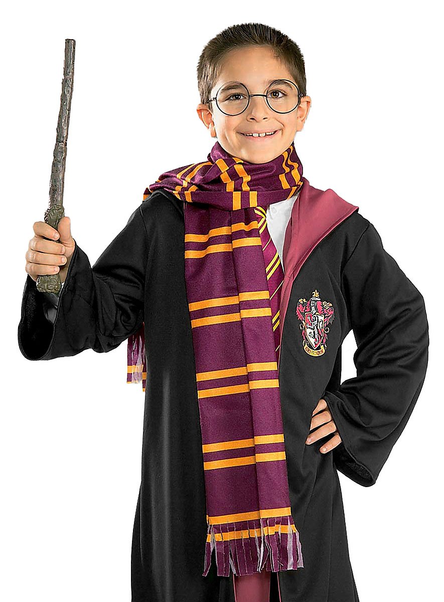Selv troldmænd fryser ikke gerne. Derfor uddeles der på Hogwarts, den skotske skole for trolddom og hekseri, varme halstørklæder til eleverne som supplement til skoleuniformerne. Som mange af elevernes tøjstykker bærer disse halstørklæder også deres respektive huses farver. Harry Potters halstørklæde er derfor holdt i Gryffindors farveskema: orange-gule striber på lilla baggrund. Det er i alt ca. 146 cm langt og har frynser i enderne. Et smukt tilbehør til jeres Harry Potter kostume – og det holder jer også varme!