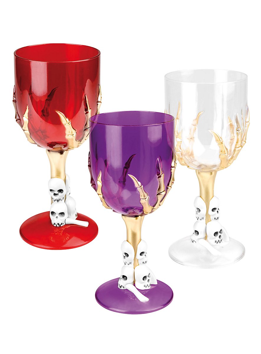 Hvid dødningehoved kalk i plastik. Pyntet med knoglehånd og dekorative dødningehoveder, rumfang 250 ml, ca. 18 cm høj!