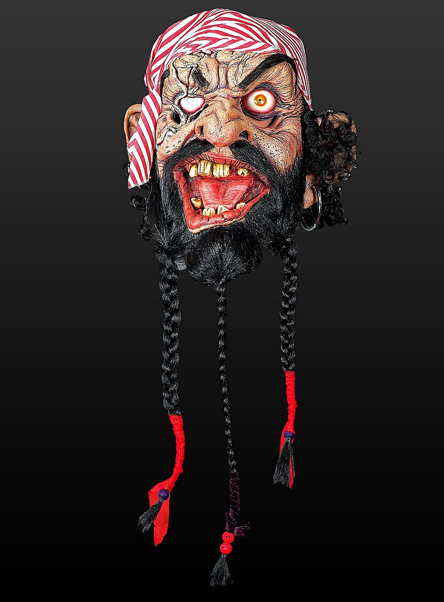 En pirat uden ar er ikke en pirat. Af denne grund pryder nogle imponerende ar vores skrålende sørøvers skæve ansigt. Hovedtørklædet og de mere eller mindre fint flettede skægfletninger er naturligvis fast forbundet med masken, hvilket både tragekomforten nyder godt af, ligesom den indvendigt polstrede hovedbund. Under de vidt opspilede øjne sidder synsspalterne, så man bedre kan vurdere værdien af sit bytte. Som ørepynt bærer kæmpemasken "Pirat" en stor og tung metalring - der kunne man uden problemer sætte en enterhage på!