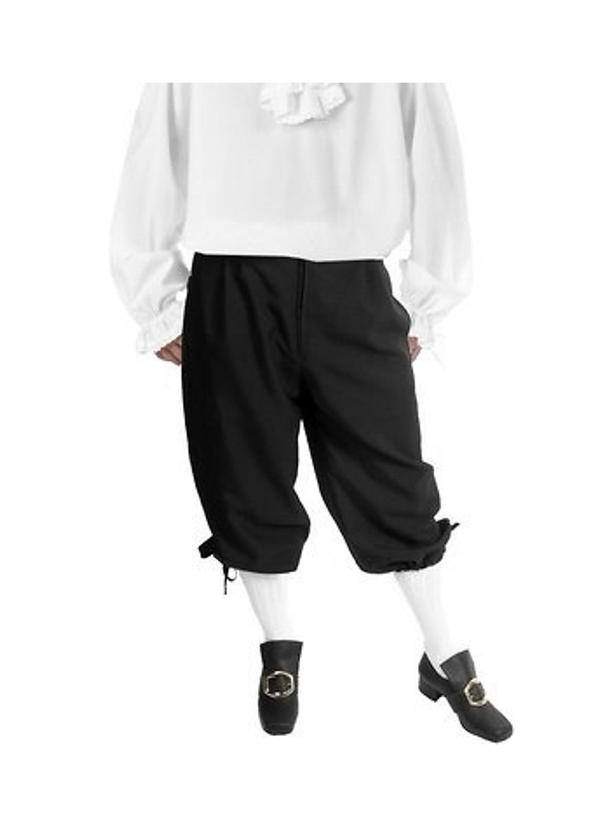 I det 17. og 18. århundrede var knæbukser eller knickers de typiske herrebukser. Vores sorte knæbukser egner sig derfor til kombination med en række historiske dragter. Knap og lynlås foran samt elastisk gummibånd i hofthøjde sørger for sikkert og behageligt hold af knæbukserne, som med deres elegante udtryk tiltrækker blikke. Benenes åbninger kan med små bånd efter smag åbnes helt eller bindes sammen. Sådan bliver de sorte knæbukser hurtigt til knickers!