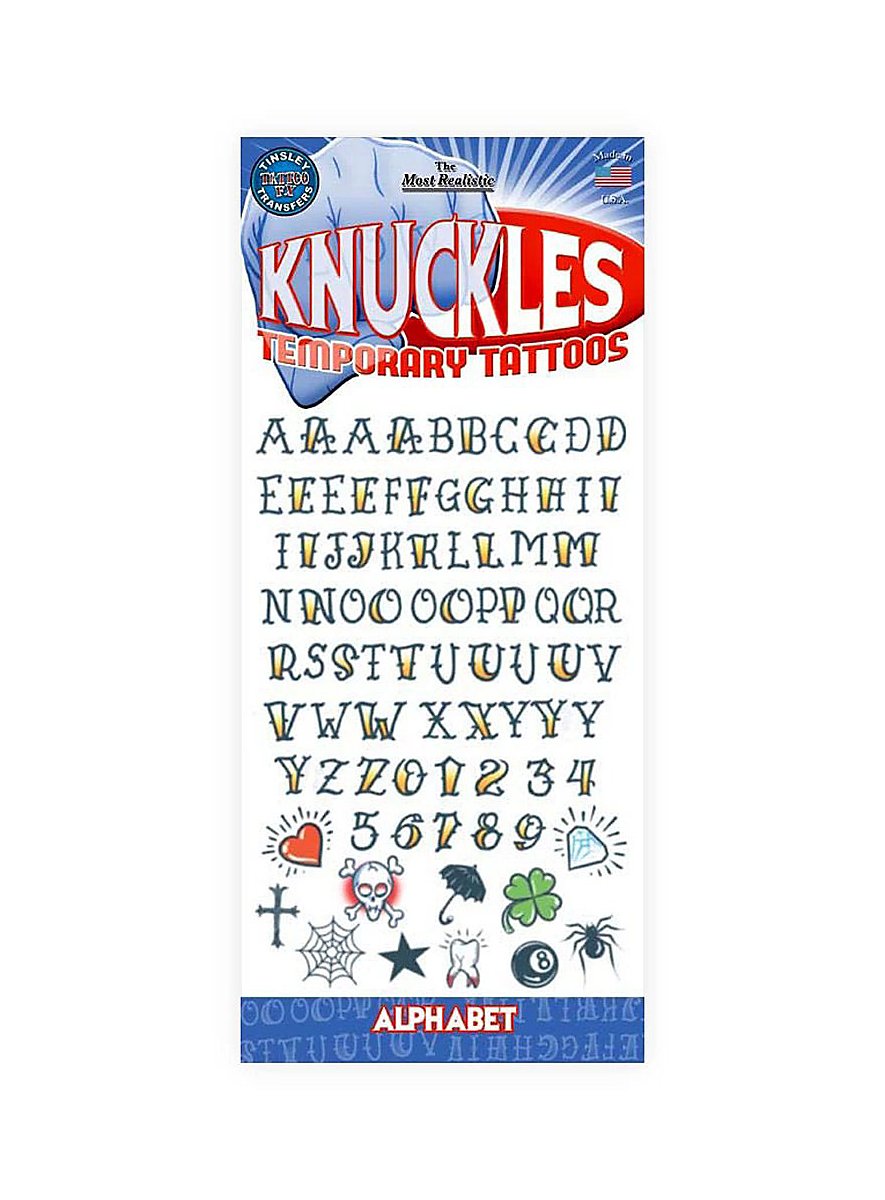 Med dette fake-tatovering-sæt kan I sammensætte jeres eget knokkel-slogan! Fra klassikeren "LOVE" og "HATE" til kreative egne ideer efterlader dette sæt ingen ønsker uopfyldte. Som det sig hør og bør for autentiske tatoveringer, er knokkel klæbe-tatovering sættet designet så det allerede virker lidt falmet og sløret – sådan bliver illusionen endnu mere overbevisende!