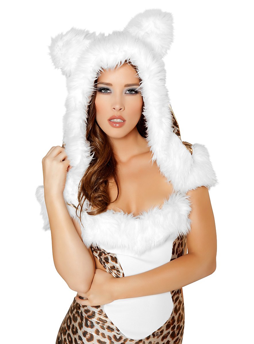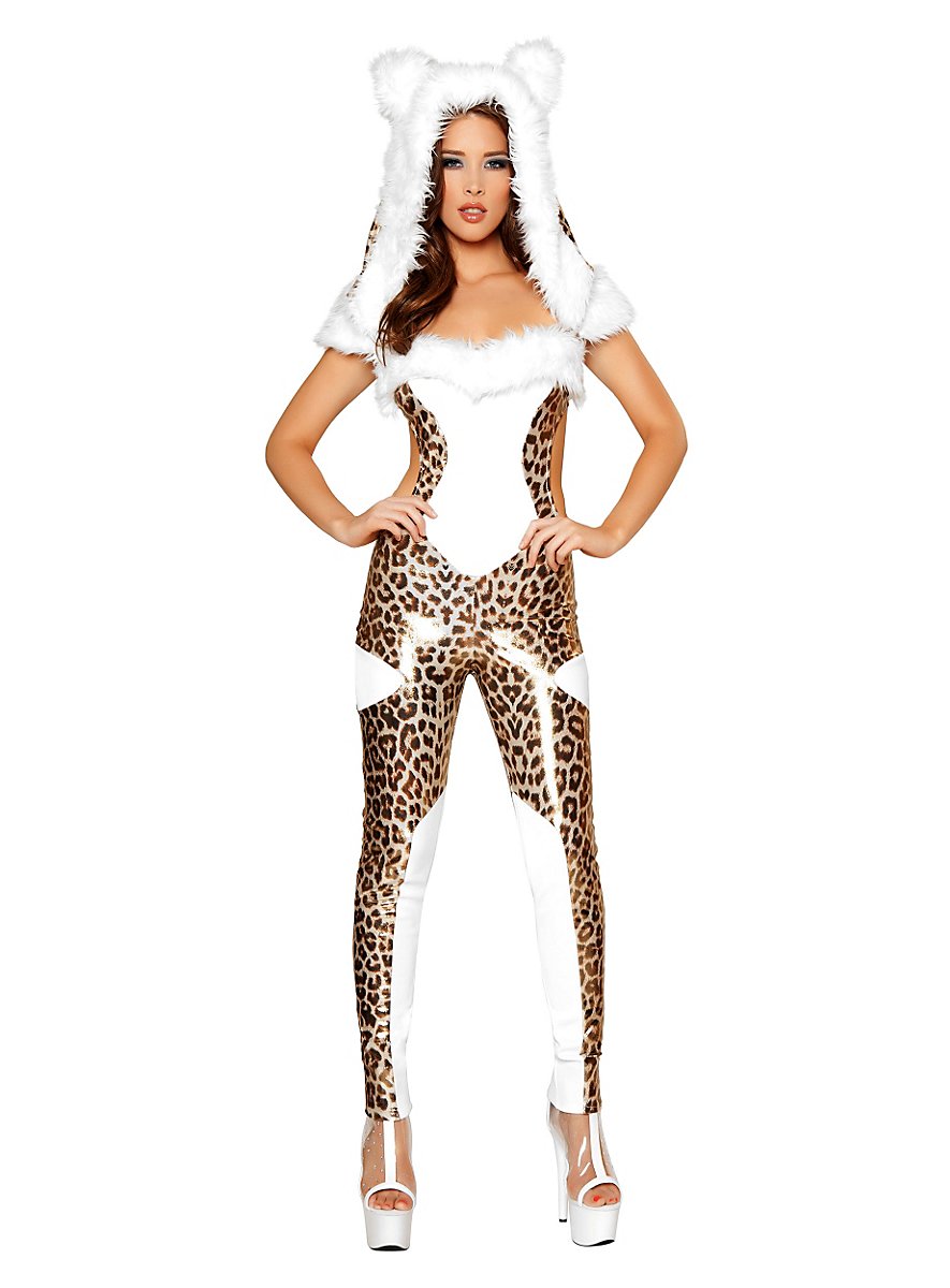 Vores Leopard Lady bærer en spændende hættedragt med stor hætte, der er vidt skåret og dermed falder divagtigt over skuldrene. Den hvide kunstpelsbesætning på kanten af hætte, udskæring og skuldre samt de kække ører viser ganske vist Leopard Lady som en sexet kælekat, men det glamourøst skinnende lamé-stof med det guldprikkede leopardmønster farer stylish især kløerne ud! Det hede look af Leopard Lady understreges yderligere af stofudskæringerne i taljen, det dybe rygudskæring samt den elastiske og dermed hudstrammende pasform af hættedragten. Selv uden hjælp fra tropiske temperaturer vil I kunne få den næste kostumefest til at koge ordentligt med Leopard Lady kostumet!