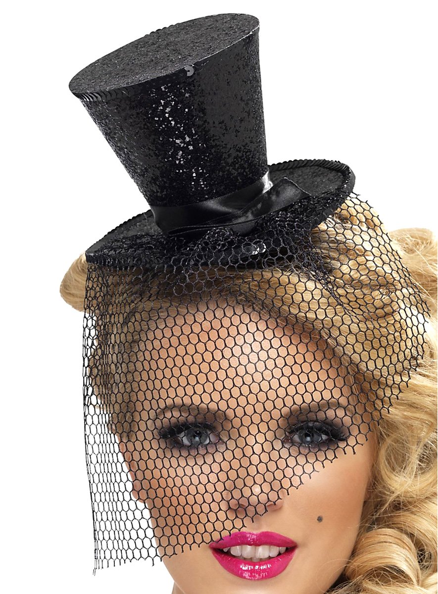 Et smukt tilbehør er denne sorte mini høj hat. Til den pailletbesatte hat hører også et sort netslør, som fastgøres til den sorte mini høj hat ved hjælp af velcro. Et smalt, justerbart bånd bruges til at fastgøre under hagen.