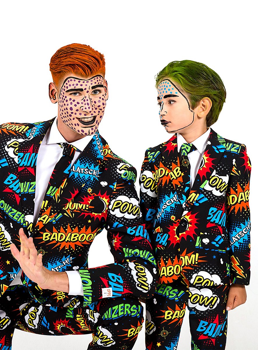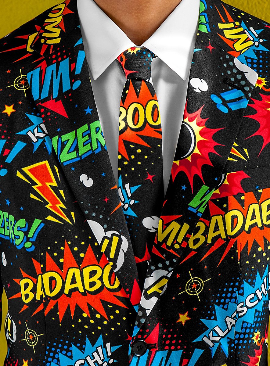 I øvrigt: Den sproglige efterligning af lydbegivenheder kalder man onomatopoesi. Man skal jo være forberedt, når man går på gulvet i vores stylede OppoSuits Badaboom jakkesæt. Det elegante sorte jakkesæt er rundt omkring dekoreret med fede "Pow", "Klatsch" og "Badaboom" symboler. Det giver jer endda pep, selvom I bare står cool i hjørnet.