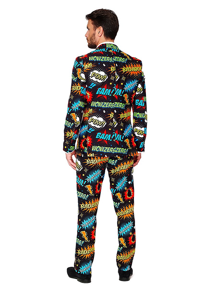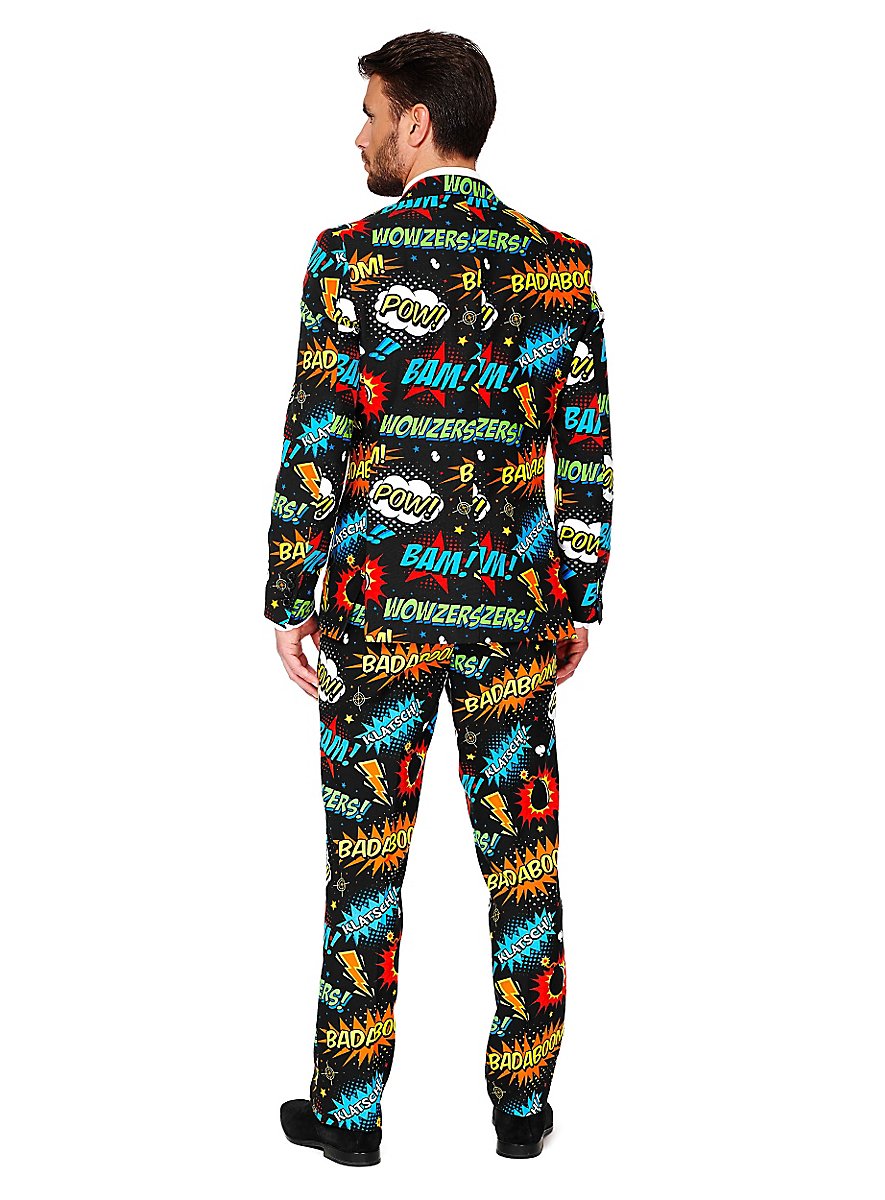 Skralt design, god pasform og høj kvalitet: Original OppoSuits jakkesæt i sort med knaldende tegneserie-dekoration! Sætter et statement til temafester, festivaler eller til polterabend!