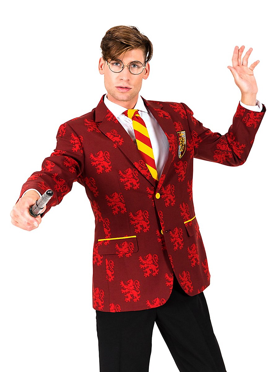 Skralt design, god pasform og høj kvalitet: Original OppoSuit i mørke røde toner med lysegule accenter - farverne fra Gryffindor hus. Mønstret med våbendyret og med påsyet skolelogo. Med jakke, bukser og rød-gul stribet slips. Sæt et statement til temafester, festivaler, conventions eller til Hogwarts-årgangsreunion.