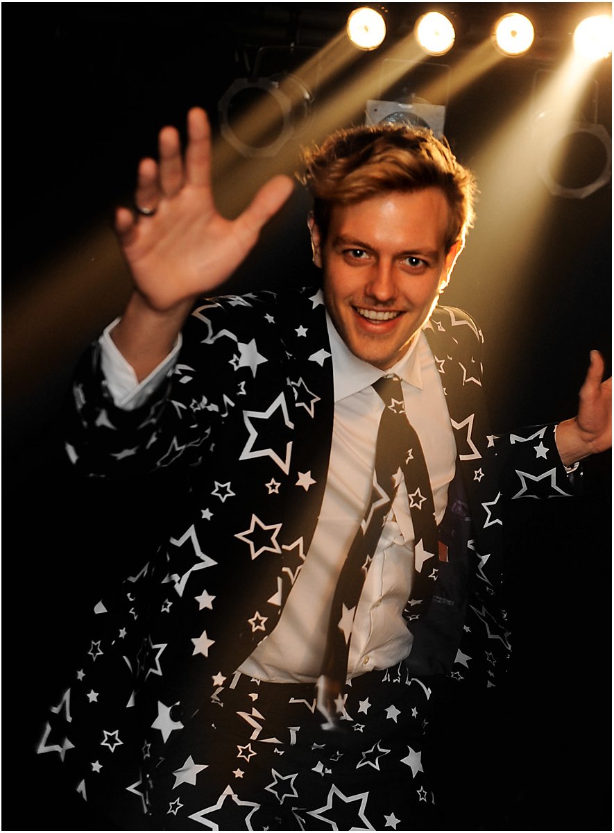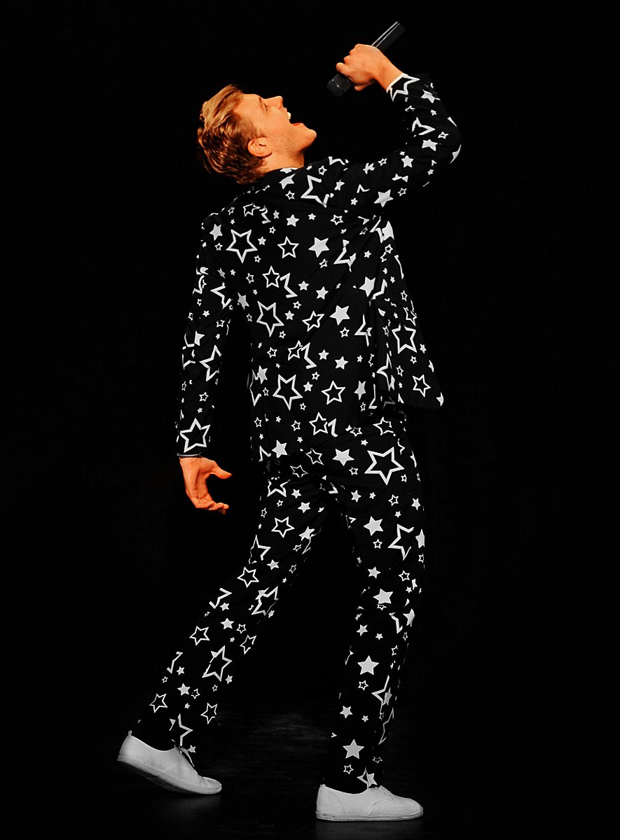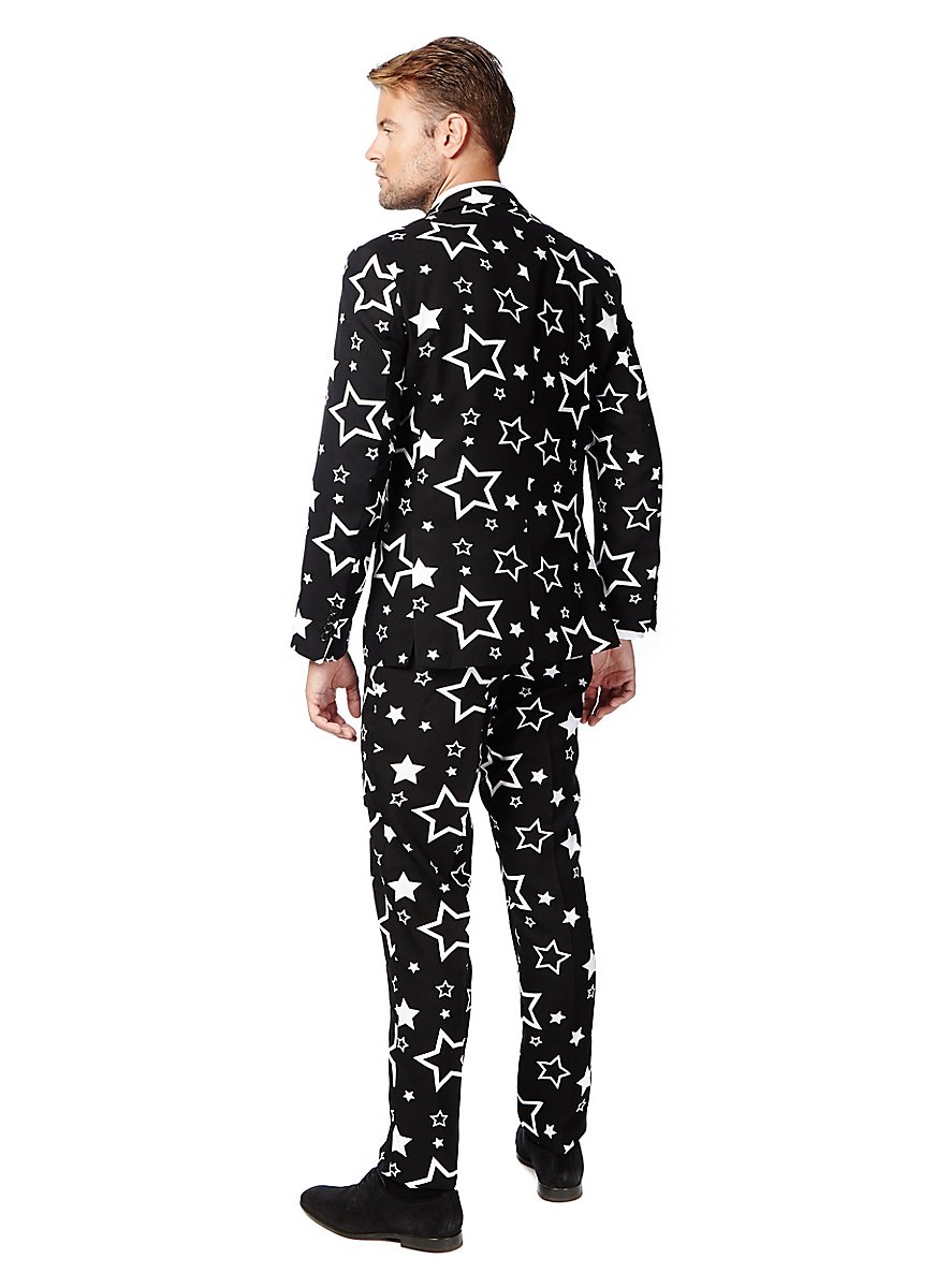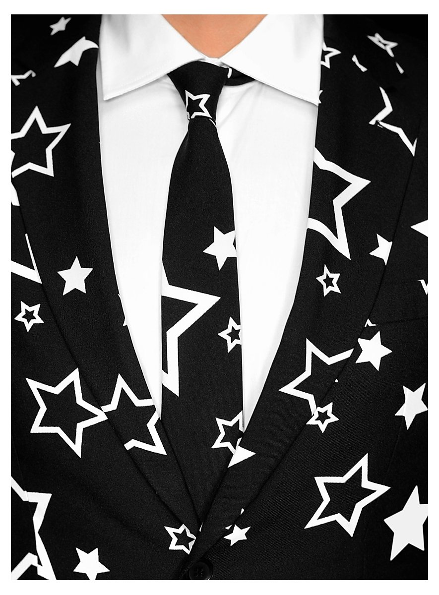 Skralt design, god pasform og høj kvalitet: Originalt OppoSuits jakkesæt med hvide stjerner på sort baggrund! Sætter et statement til temafester, festivaler eller til polterabend!