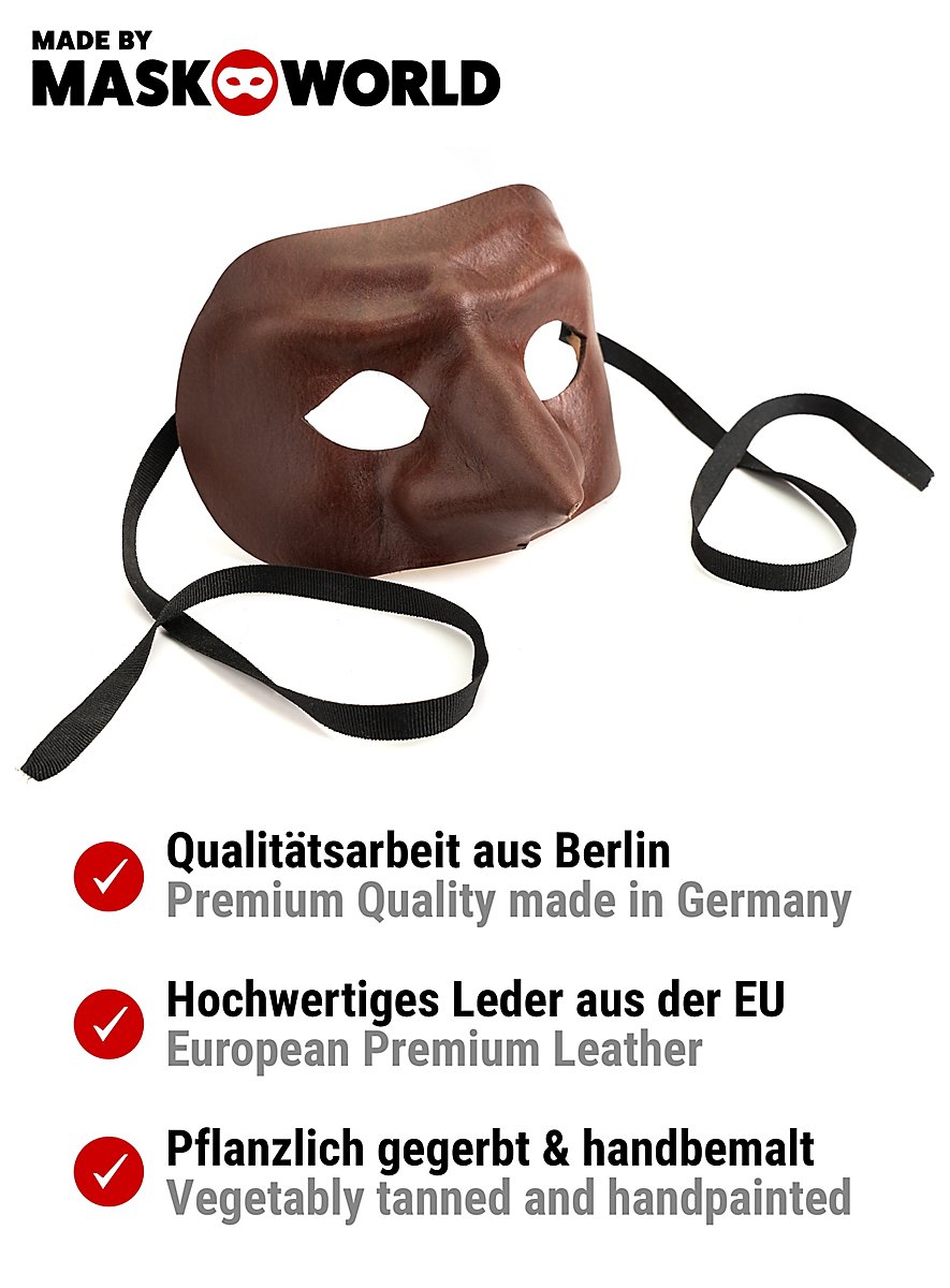 De mystiske lædermasker, udtryk for sanselig og poetisk kunst, blev oprindeligt fremstillet i Venedig som teatermasker til scenen og er i dag et forførende tilbehør til fortryllende kostumer. Det smidige, bøjelige læder er det autentiske materiale fra den tid og nyder stadig stor popularitet i dag. Det tilpasser sig perfekt til bærerens ansigt, lader huden ånde og kan derfor bæres behageligt og komfortabelt i flere timer - ideelt til en sceneoptræden eller en festlig balnat.