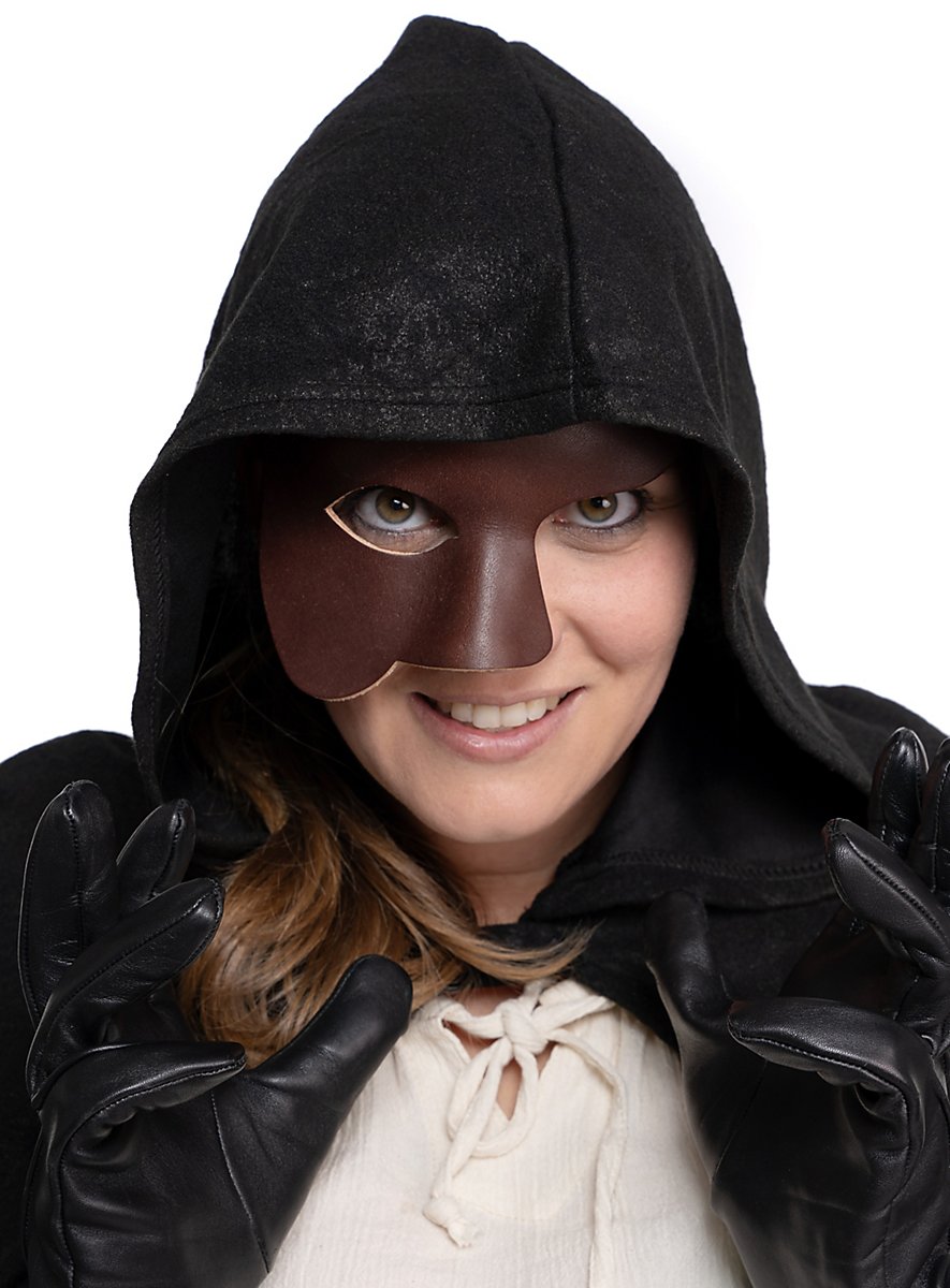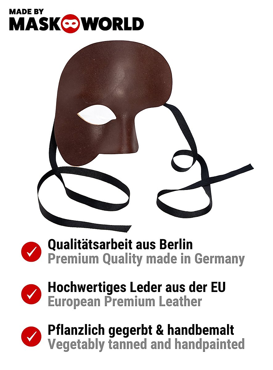 De mystiske lædermasker, udtryk for sensualitet og poesi, blev oprindeligt fremstillet i Venedig som teatermasker til scenen og er i dag et forførende tilbehør til fortryllende kostumer. Det smidige, bøjelige læder er det autentiske materiale fra den tid og nyder stadig stor popularitet i dag. Det tilpasser sig perfekt til bærerens ansigt, lader huden ånde og kan derfor bæres behageligt og komfortabelt i flere timer - ideelt til en sceneopførelse eller en festlig balnat.