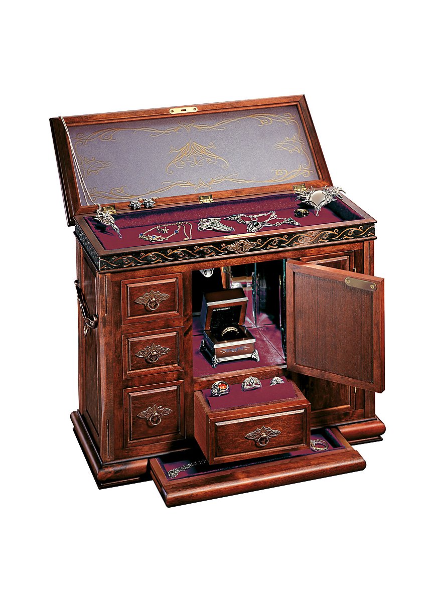 Kostbare smykker skal opbevares på værdig vis - og netop det er formålet med denne smukke skattekiste. Den består af mørkt, antikt udseende træ og er foroven udstyret med en dekorativ kant i sølv-optik. Der er i alt fem skuffer, to skabsrum samt et låsebart lågrum, som alle er beklædt med rødt fløjl. Det centrale rum har intet håndtag - det åbnes via trykmekanisme og egner sig derfor til helt særlige skatte, da det desuden er spejlet. Det låsbare lågrum er forfinet med uigennemsigtigt glas og elviske rankmønstre. Metalbeslagene og de sideværende håndtag giver skattekisten et ekstra pust af rustikalitet.