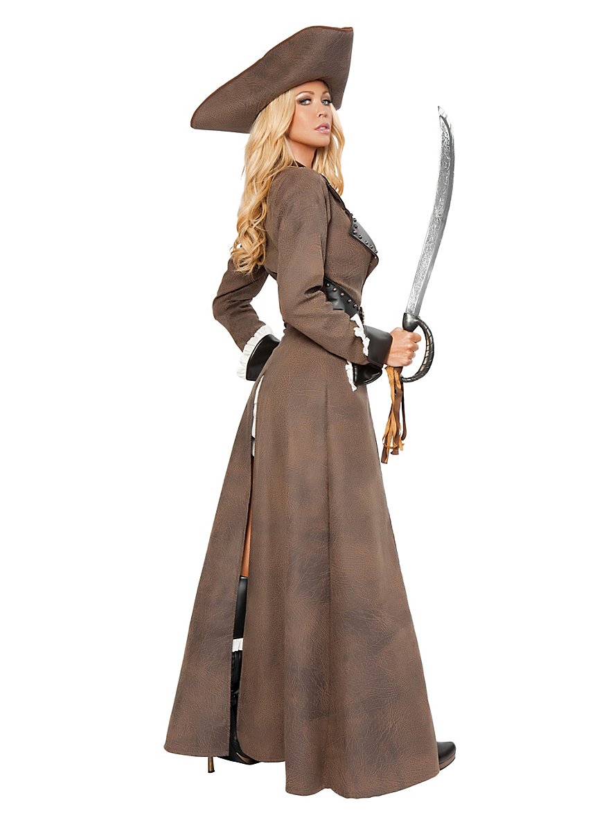 Frygtet og eftertragtet er denne pirat! Kostume seksdelt med lang frakke med bæltespænde, med minikjole, med trekantet hat og plastik-sabel!