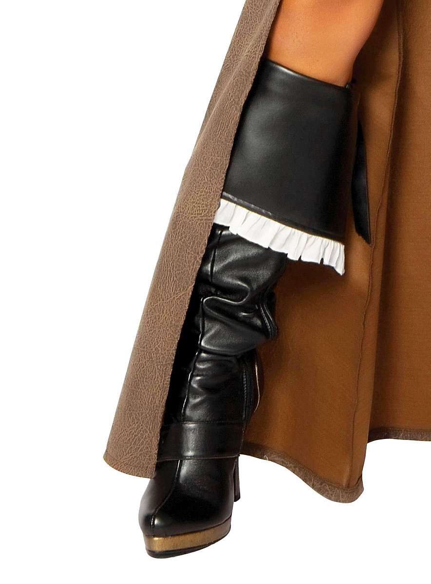 Det elegante kostume består af en naturhvid minikjole, der i romantiske folder perfekt omspiller de kvindelige rundinger. Den stropløse udskæring er pyntet med et gummibånd og en sød flæse, mens den godt skjulte, sidevendte lynlås gør det nemt at tage på og af. Derover sidder den fantastiske admiralsfrakke i brunt, det bløde materiale minder i sit mønster om antiklæder og understreger den imponerende aura hos denne sexede sørøver. Snittet er figurnært i taljen, her sidder også frontalt en praktisk lynlås, mens frakken nedefter flyder ud i en gulvlang, voluminøs søm. Den falder åben foran fra taljen og også bagpå trækker sig en slids fra taljen nedefter, det skaber bevægelsesfrihed i kampen og lader desuden frakken flagre dramatisk ved hurtige skridt eller hård blæst.