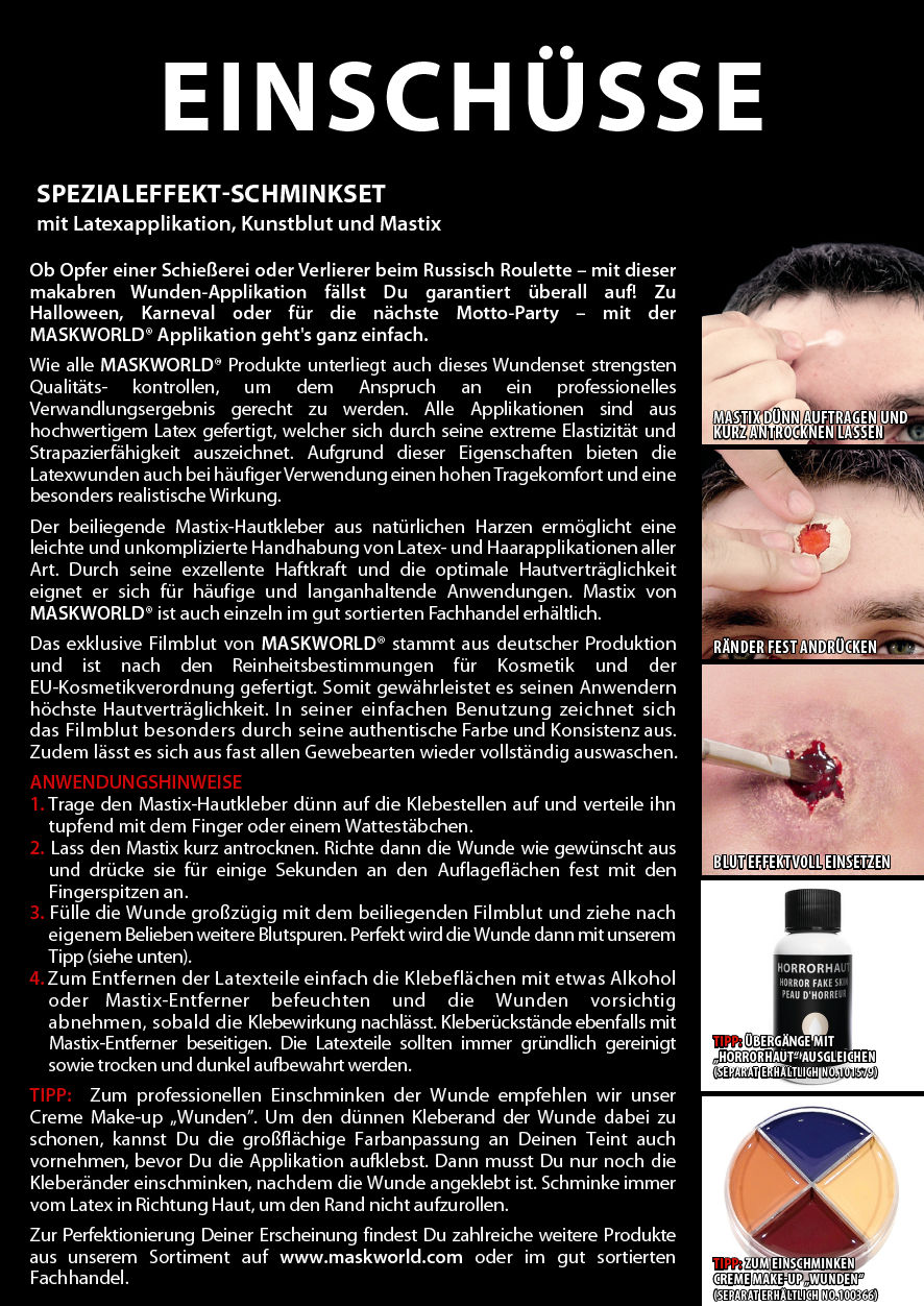 Med denne professionelle skudsår latex-applikation kan du nemt og hurtigt forvandle dig til et lig, en levende død eller en anden karakter fra din fantasi. Som alle maskworld produkter er også dette skudsår-sæt underlagt de strengeste kvalitetskontroller for at leve op til kravet om et professionelt forvandlingsresultat. Alle maskworld latex-applikationer er håndlavede. Latex udmærker sig ved sin ekstreme elasticitet og holdbarhed. På grund af denne egenskab tilbyder applikationerne også ved hyppig brug høj bærekomfort og en særligt realistisk virkning. Mastix lim udmærker sig ved fremragende klæbeevne og optimal hudkompatibilitet.