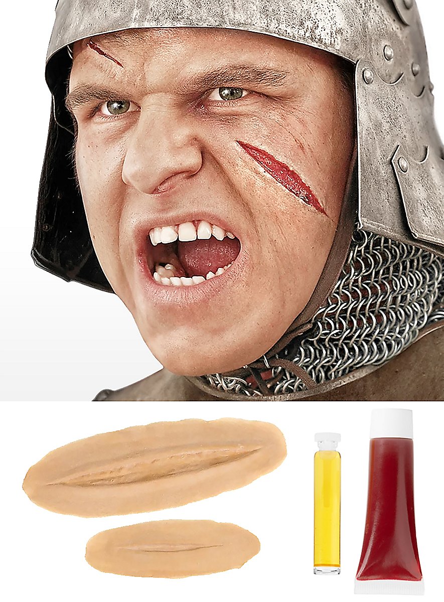 Med dette professionelle snitlæsions-sæt kan du nemt og hurtigt forvandle dig til en kriger eller en anden karakter fra din fantasi. Som alle maskworld produkter er også dette snitlæsions-sæt underlagt de strengeste kvalitetskontroller for at leve op til kravet om et professionelt forvandlingsresultat. Alle maskworld latex-applikationer er håndlavede. Latex udmærker sig ved sin ekstreme elasticitet og holdbarhed. På grund af denne egenskab tilbyder applikationerne også ved hyppig brug høj bærekomfort og en særlig realistisk virkning.