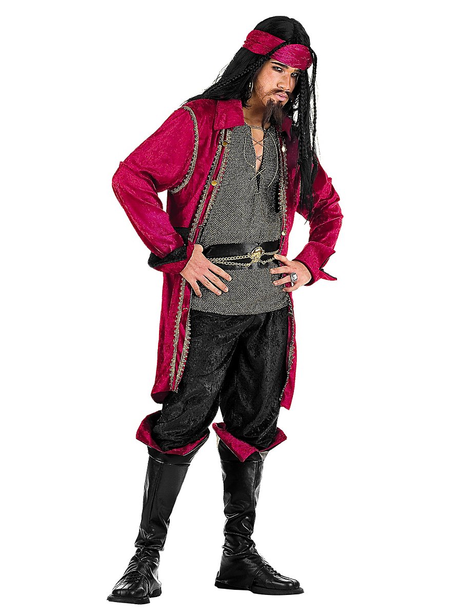 Den, der vil være en rigtig sørøver, plyndrer og sænker skibe, sender fanger over planken og søger efter skattøer. Sørøverens garderobe er i hvert fald passende til alle disse lejligheder. I den røde jakke, designet med guldborter og opslåede manchetærmer, er der syet et gråt skjorte med snøring ind. Til jakken passer det matchende pandebånd perfekt. Det sorte bælte er pyntet med guldkædер og harmonerer med de behagelige, mørke bukser. Dertil bærer en ægte sørøver naturligvis stilfulde, knæhøje støvleovertræk. I dette outfit kan man ikke kun gøre oceanerne usikre!