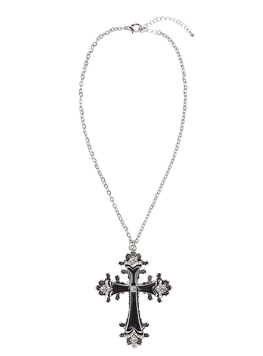 Til vampyrer, onde dronninger, religionskostumer og gotiske outfits: stort sort metalkors med glas-smykkesten på en sølvkæde.