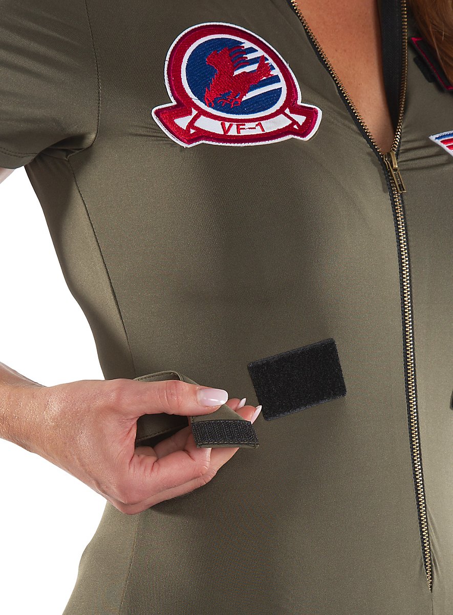 Kultisk og forførende: Sexet Top Gun Catsuit kostume med lynlås, lommer og originale påsyede mærker.