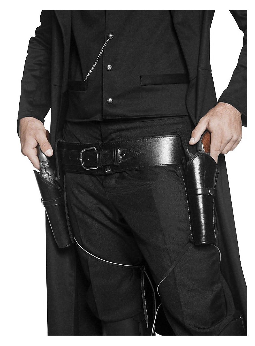 Den hvide forskjorte, der bæres under vesten, kommer med en påsyet lysende rød cowboyløkke, som er pyntet med en perle. Det brede pistolbælte i sort læderimitation, der sidder afslappet om hofterne, har to hylstertasker med prydlasker og hver især et læderbånd, hvormed hylstrene kan fastgøres om låret. - "Spil mig sangen om døden" hilser!