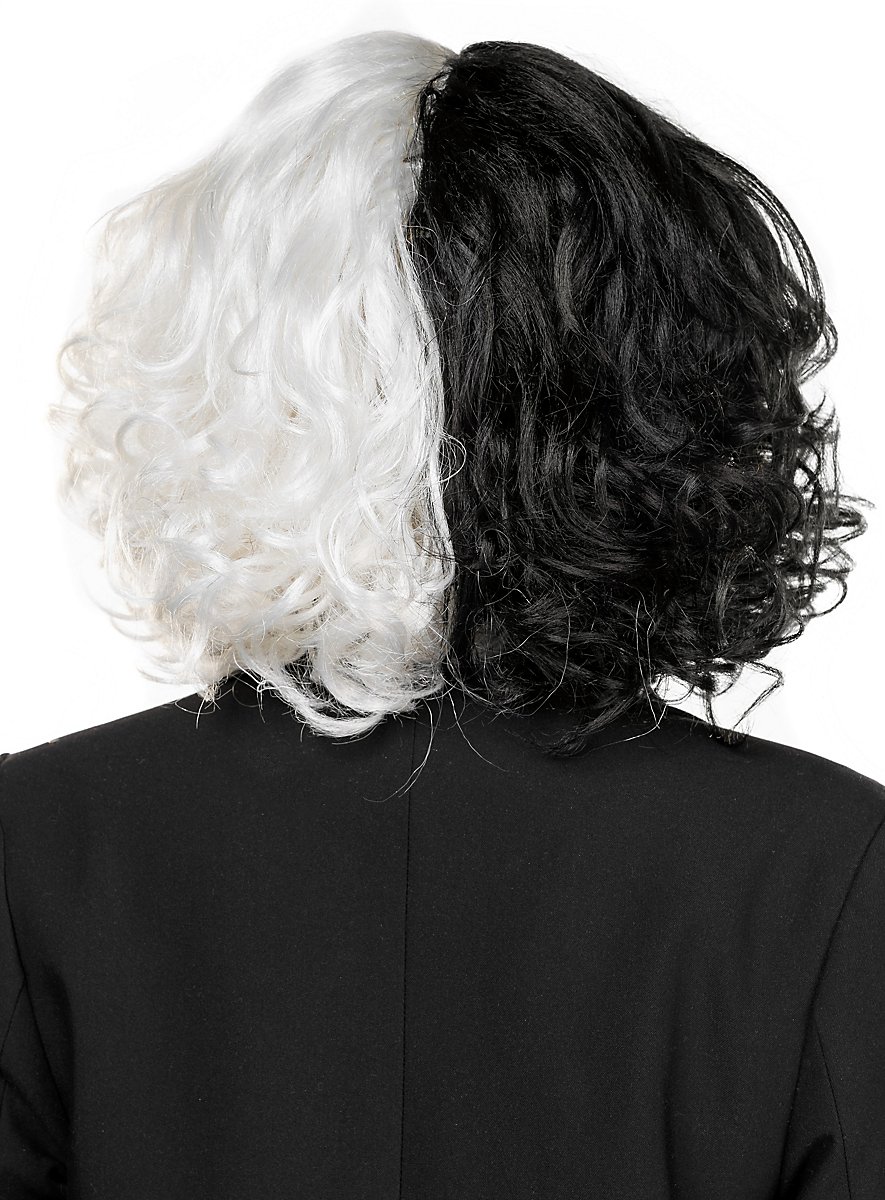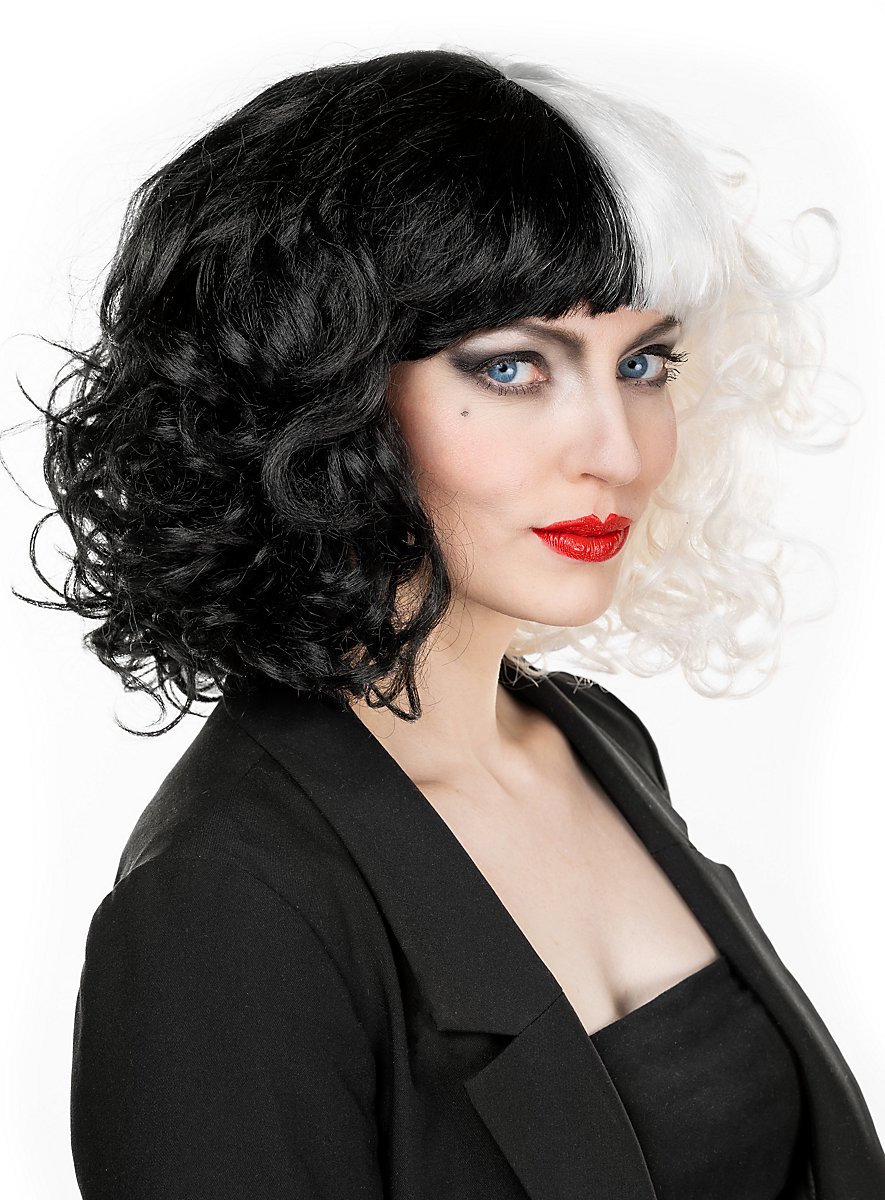 • hälftig schwarz und weiß gefärbtes Kunsthaar mit gelockten Seiten und geradem Pony