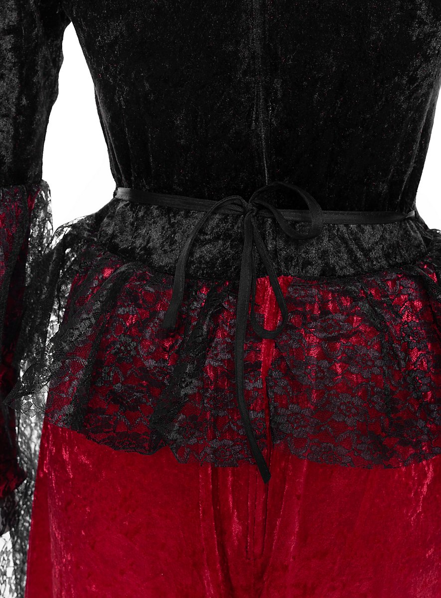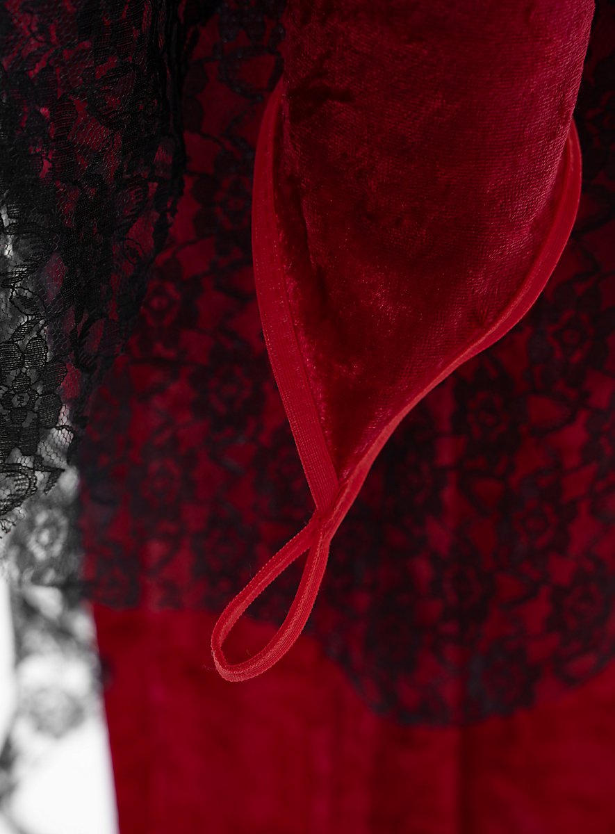 Wenn sich die Dämonenbraut einmal in die Öffentlichkeit wagt, dann sorgt ihr feuriges Outfit regelmäßig für offene Münder. Das bodenlange, herrschaftliche Kleid ist aus glänzendem, strukturiertem Stoff gefertigt, dessen verspielter schwarz/rot Kontrast einer Dämonin würdig ist. Die eng anliegenden Ärmel sind mit so üppiger Spitze versetzt, dass die Bezeichnung "Braut“ wirklich nicht von ungefähr kommt. Zudem laufen die Ärmel spitz zu und besitzen eine stilvolle Schlaufe für den Mittelfinger - allerdings sind diese nur für schmalere Arme angelegt.