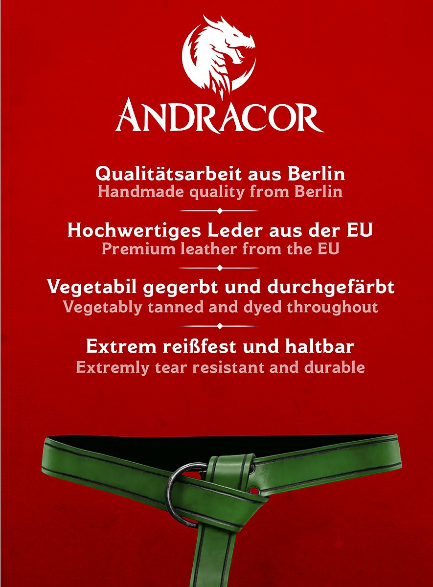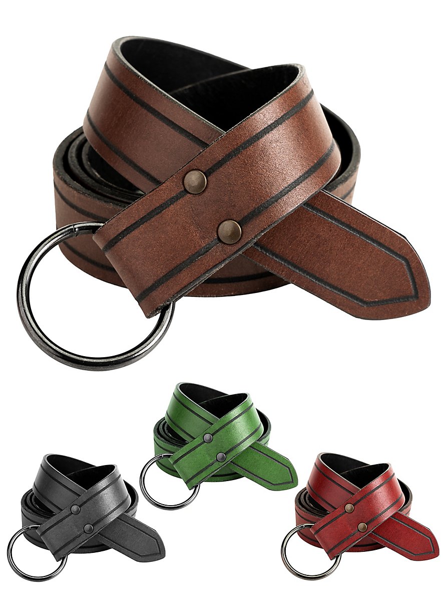 It is handmade from 3 - 4 mm thick leather and vegetable tanned. The heavy metal ring and the grooved decoration are suitable for a variety of characters. No matter if knight, magician or elf. The Belt is vailable in black, brown, green and red!