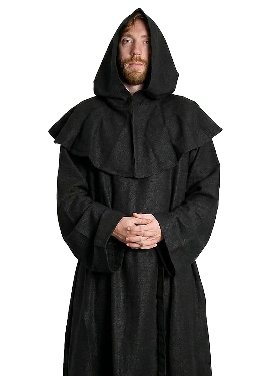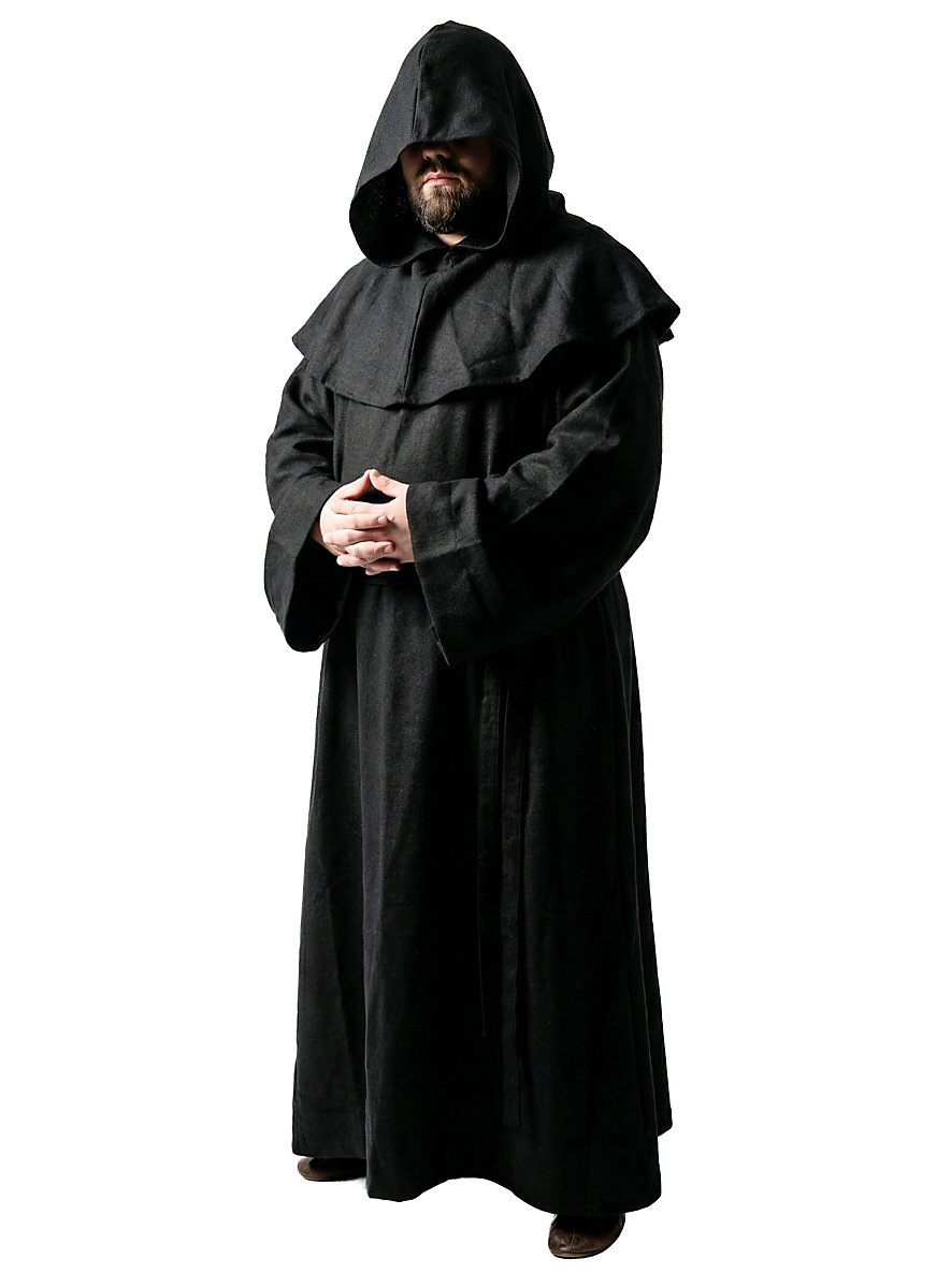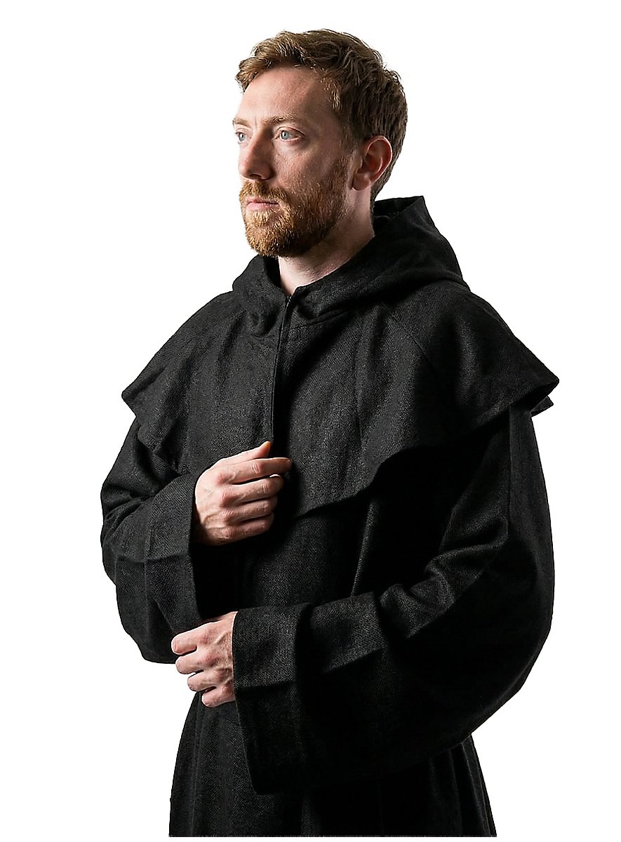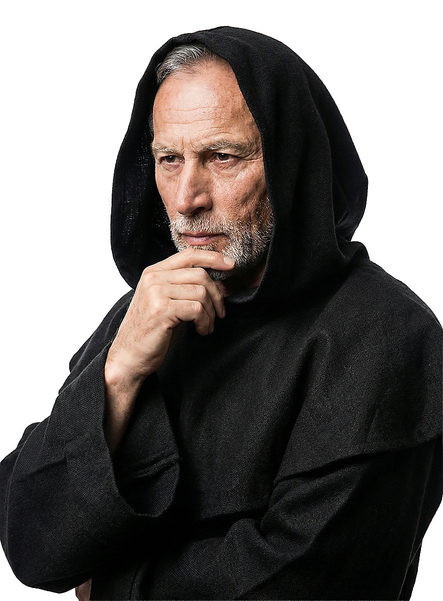 This black robe and cowl are made of heavy, coarsely woven cotton, and a broad cord belts the waist. His humble appearance is a sign of power and religious sublimation at the same time. Thanks to the generously cut cowl and long robe, this monk is perfectly protected from wind and weather on his journey through life.