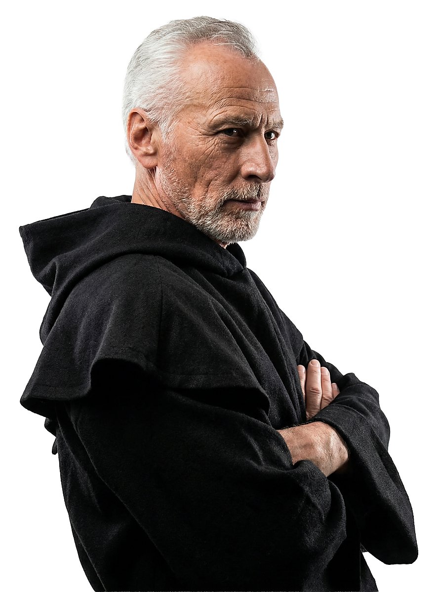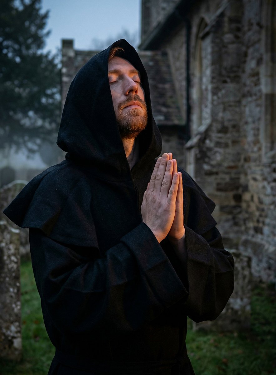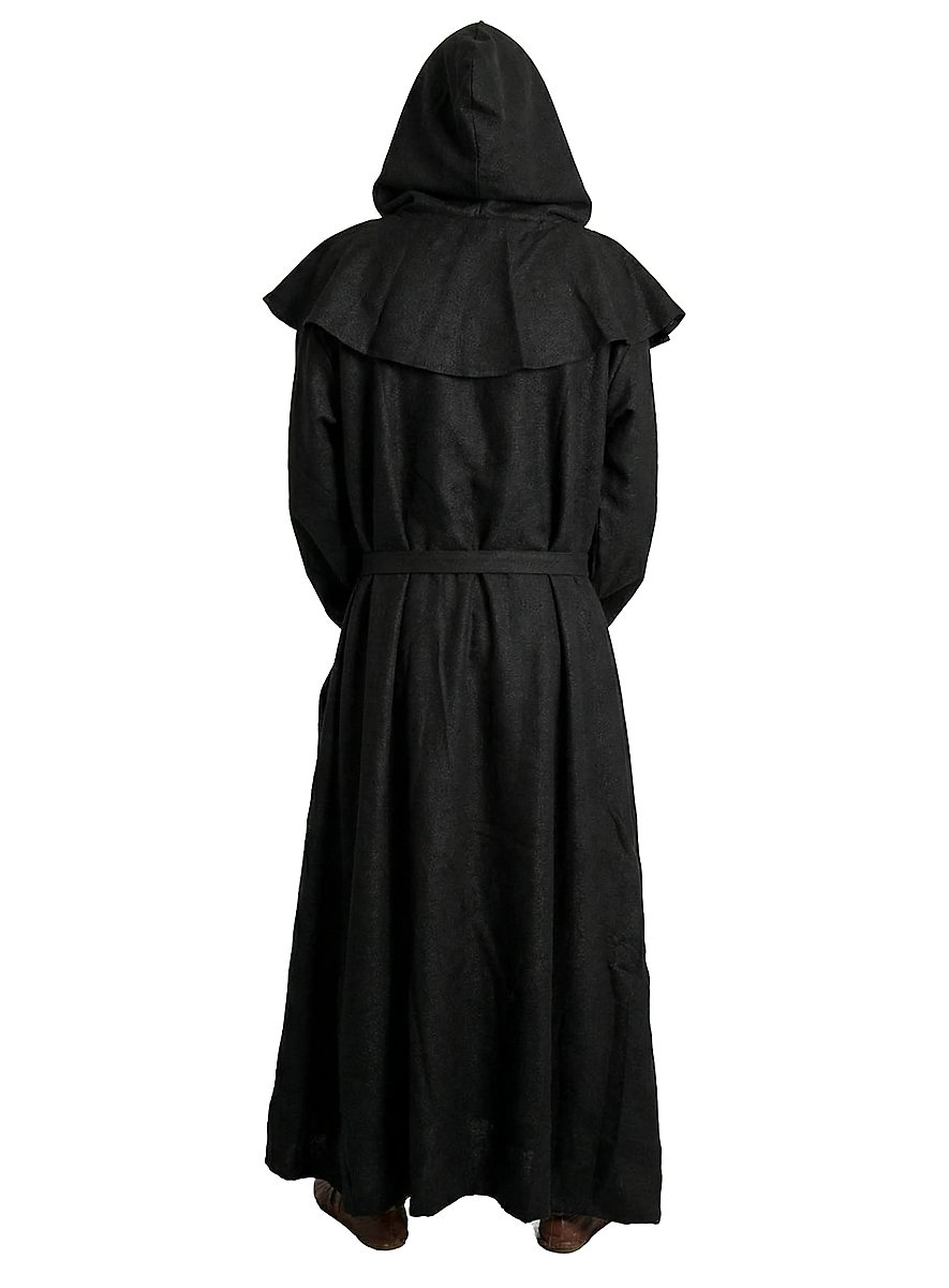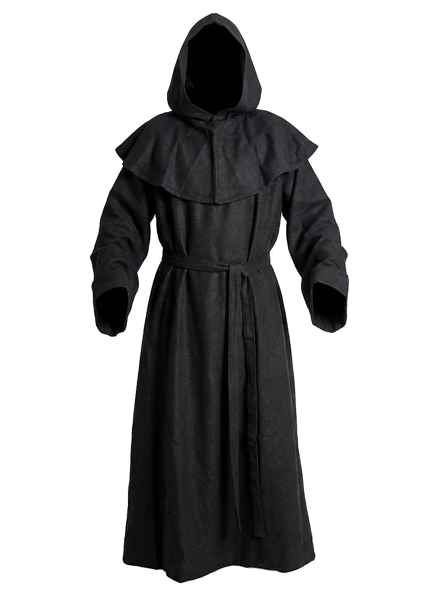 This black robe and cowl are made of heavy, coarsely woven cotton, and a broad cord belts the waist. His humble appearance is a sign of power and religious sublimation at the same time. Thanks to the generously cut cowl and long robe, this monk is perfectly protected from wind and weather on his journey through life.