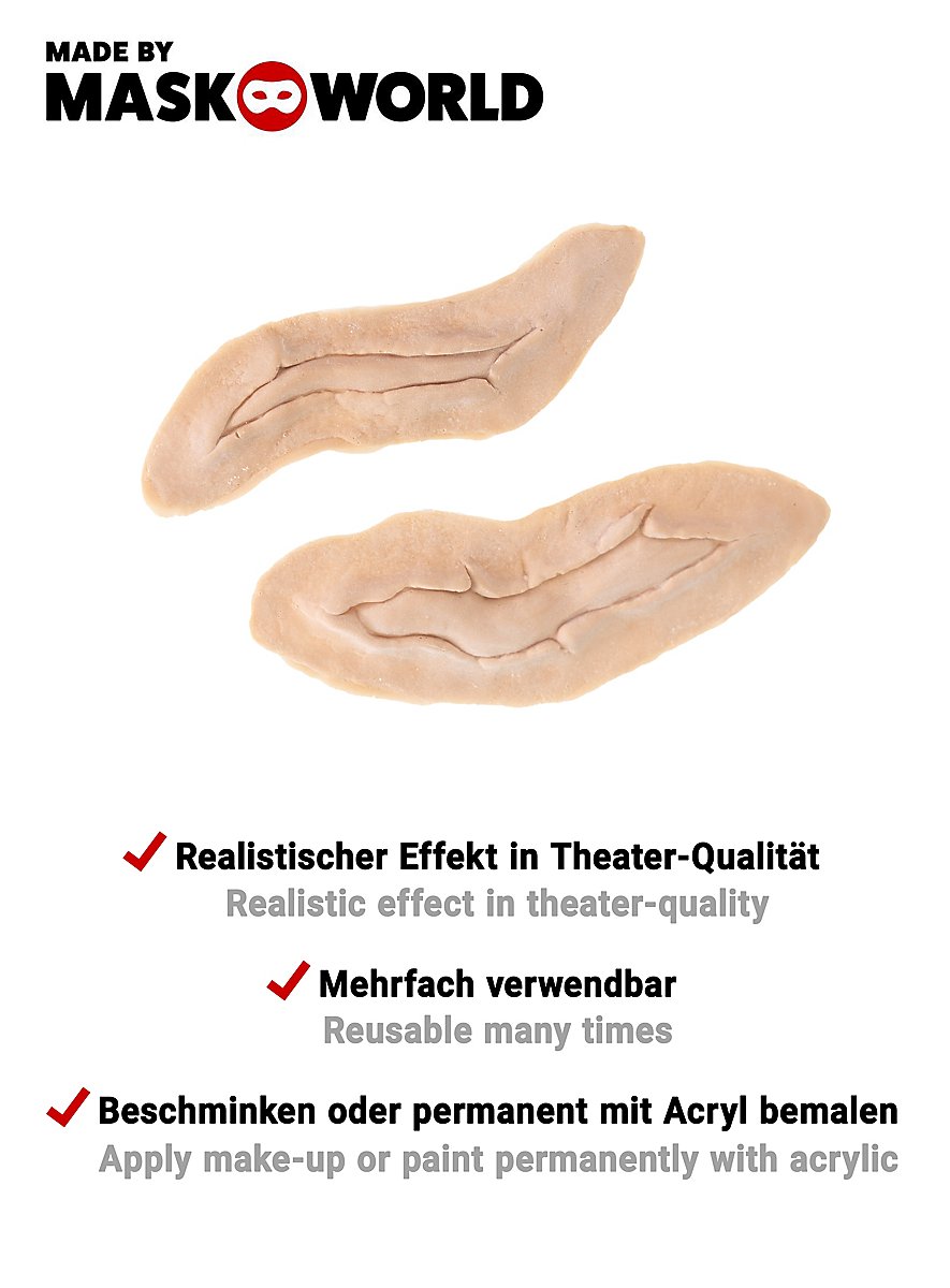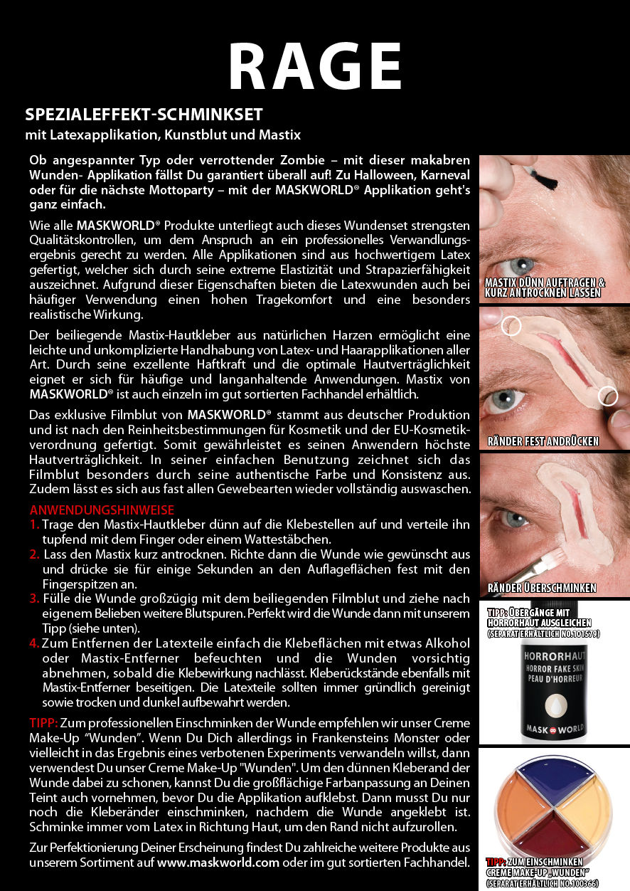 Con esta aplicación profesional de látex de heridas Rage puedes transformarte fácil y rápidamente en un psicópata malvado o en cualquier otro personaje de tu imaginación. Como todos los productos maskworld, este set Rage también está sujeto a los controles de calidad más estrictos para cumplir con los estándares de un resultado de transformación profesional. Todas las aplicaciones de látex maskworld están hechas a mano. El látex se caracteriza por su extrema elasticidad y resistencia. Debido a esta propiedad, las aplicaciones ofrecen un alto confort de uso y un efecto especialmente realista incluso con uso frecuente. El pegamento mastix se caracteriza por su excelente poder adhesivo y óptima compatibilidad con la piel.