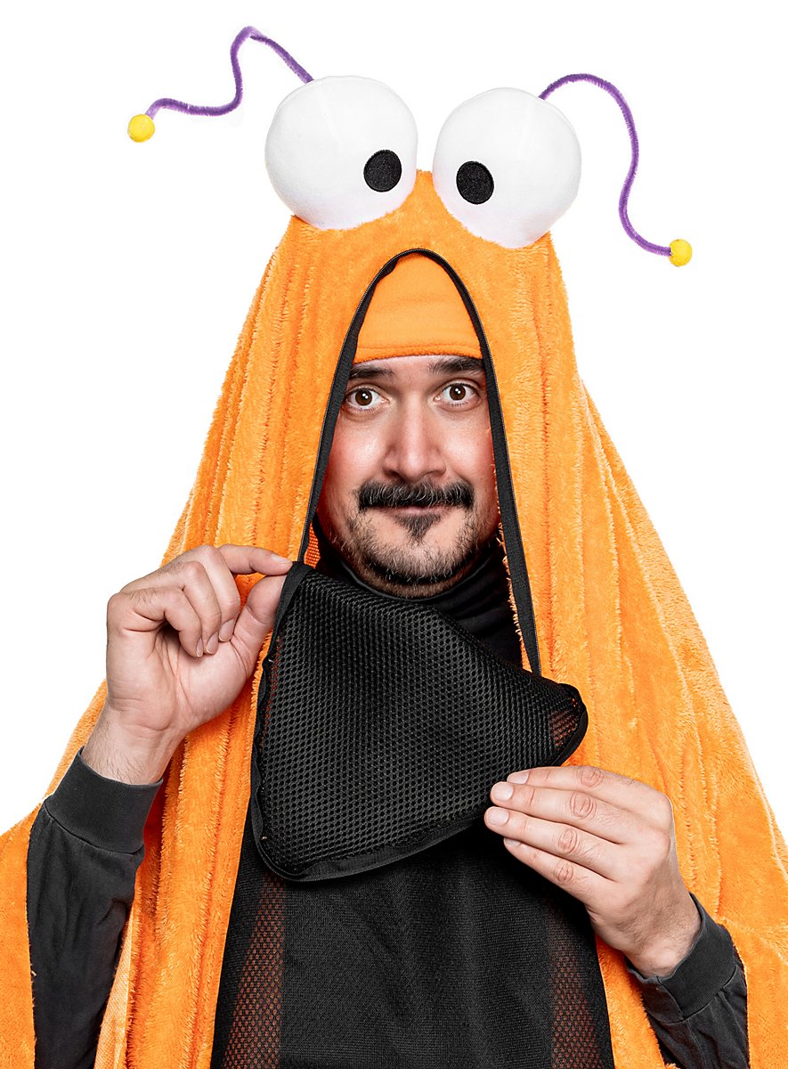 El disfraz no tiene botones ni otros cierres, sino que simplemente se pone como un saco por encima. El interior de la cabeza está formado como una especie de gorro, para que el disfraz tampoco se deslice tan fácilmente. La abertura negra de la boca está hecha de tela de red, que te permite una buena visión hacia afuera. Además, la red se puede abrir con un cierre de cremallera, que te da la posibilidad de comer y beber sin tener que quitarte el disfraz. El "labio inferior" del Yip Yip está engrosado, para que puedas moverlo arriba y abajo con tus manos y crear expresiones divertidas. Lateralmente el disfraz ofrece ranuras no visibles, por las que puedes sacar tus brazos si es necesario. Las antenas junto a los ojos grandes también se pueden doblar como limpiapipas. ¡Con este disfraz de marciano garantizas algunas risas! Exclusivo de MASKWORLD.