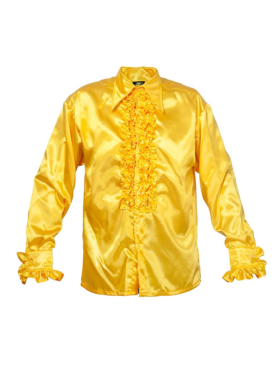 ¡Con esta camisa de volantes estrella del pop amarilla podrás lucirte como un rompecorazones cantante de baladas con gran efecto! El gran cuello puntiagudo al estilo de los años 70 y los volantes maravillosamente fruncidos en los puños y en la zona del pecho te convierten en el Rey del Pop. ¡La superficie satinada brillante se refleja en amarillo radiante bajo los focos del escenario! Esta camisa de satén desprende pompa y extravagancia para la gran actuación, ¡las chicas te van a adorar!