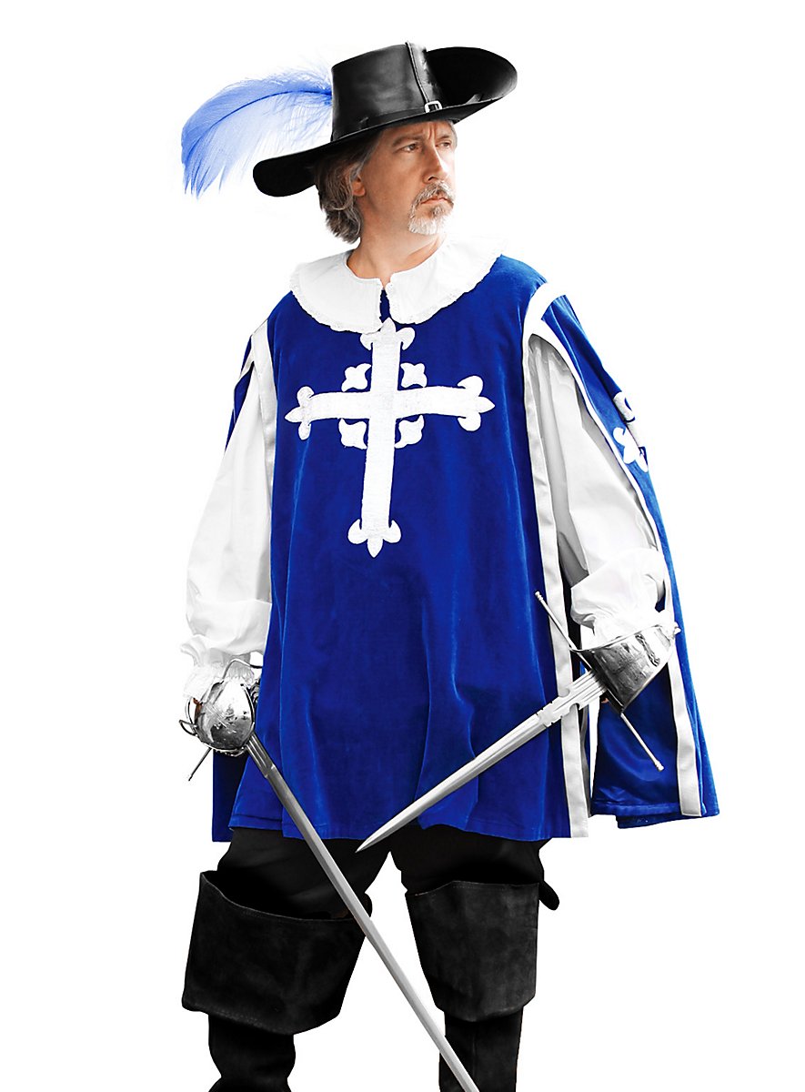 Esta réplica única de una casaca heráldica de mosquetero francés está confeccionada en exquisito terciopelo de algodón azul y forrada interiormente con el más fino satén. En el pecho y los laterales, la casaca está adornada con cruces plateadas bordadas a mano y la flor de lis real, mientras que el dobladillo está ribeteado con un amplio galón plateado. El corte generoso garantiza al mosquetero suficiente libertad de movimiento, tanto en el combate mortal de esgrima contra los siniestros secuaces del Cardenal Richelieu, como en el cortejo a la bella feminidad.