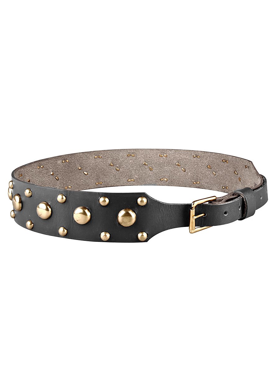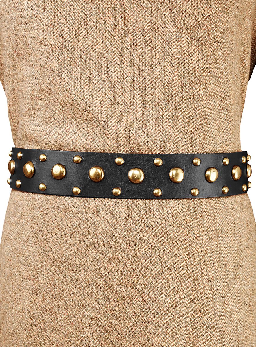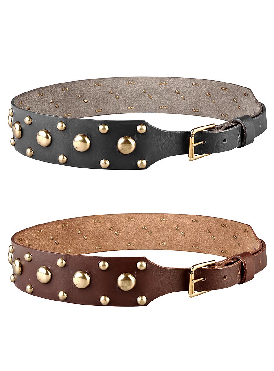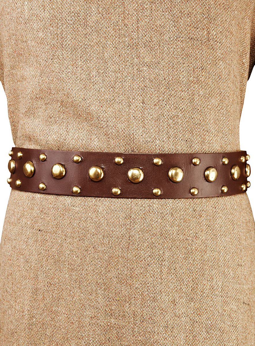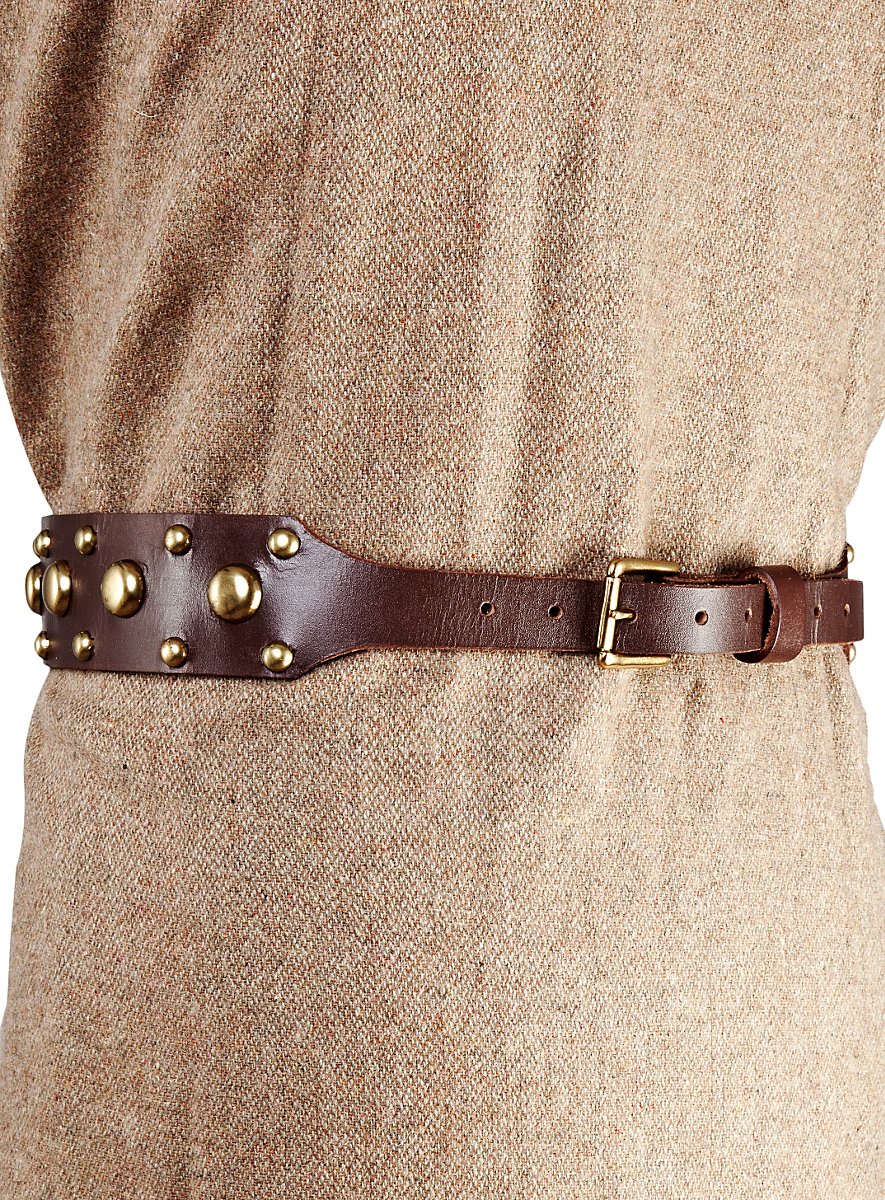 El cinturón, que mide 5 cm de ancho en su parte más gruesa, está hecho a mano de cuero y está abundantemente equipado con remaches de latón y una hebilla de latón. Se puede llevar como prenda de vestir sobre una túnica y para sostener una espada.