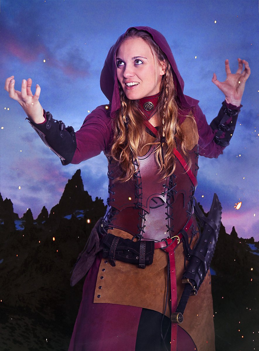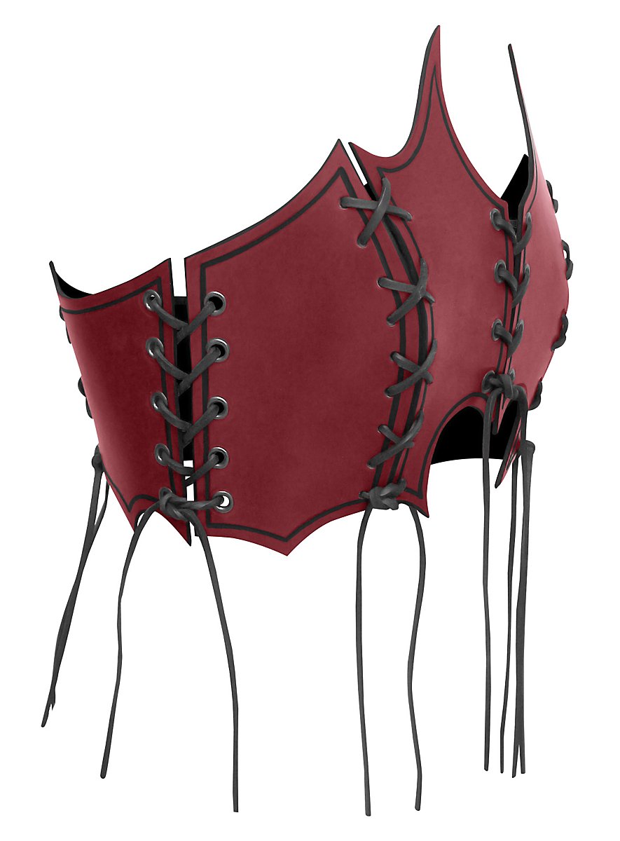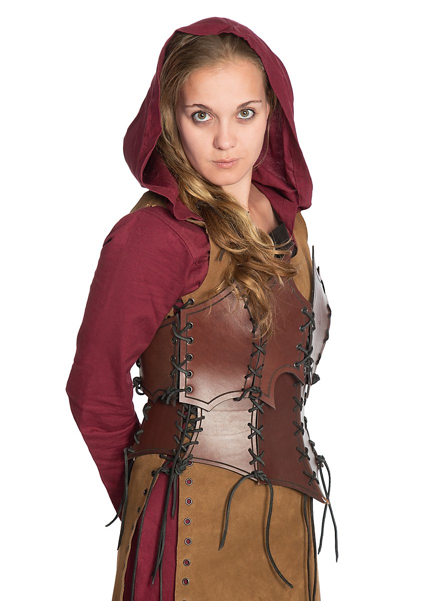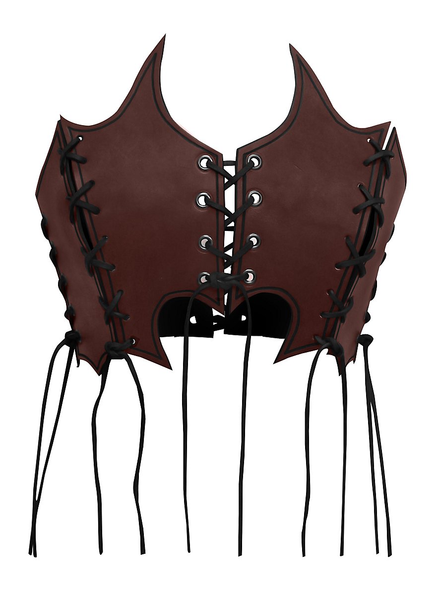 Nuestro corsé Bruja está fabricado a mano con cuero curtido vegetal de 3-4 mm de grosor para armaduras y decorado con ornamentación acanalada. El corsé de cuero - Bruja se compone de un total de ocho elementos de cuero que se conectan entre sí mediante ocho cordones. Esta forma de bordes afilados le da a quien lo lleva un aspecto especialmente peligroso y además permite un ajuste individual, completamente adaptado al cuerpo de la portadora.