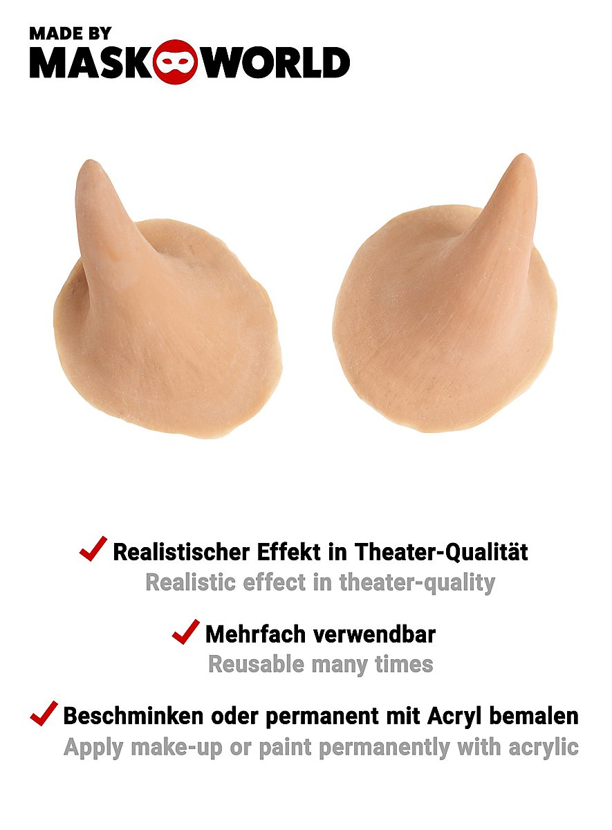 Con este set profesional de cuernos de MASKWORLD puedes transformarte fácil y rápidamente en un demonio, un diablo o en cualquier otra criatura con cuernos de tu imaginación. Como todos los productos MASKWORLD, este set de cuernos también está sujeto a los controles de calidad más estrictos para cumplir con los requisitos de un resultado de transformación profesional. Todas las aplicaciones están hechas a mano con látex de alta calidad, que se caracteriza por su extrema elasticidad y durabilidad. Debido a estas propiedades, ofrecen un alto confort de uso y un efecto especialmente realista incluso con uso frecuente.