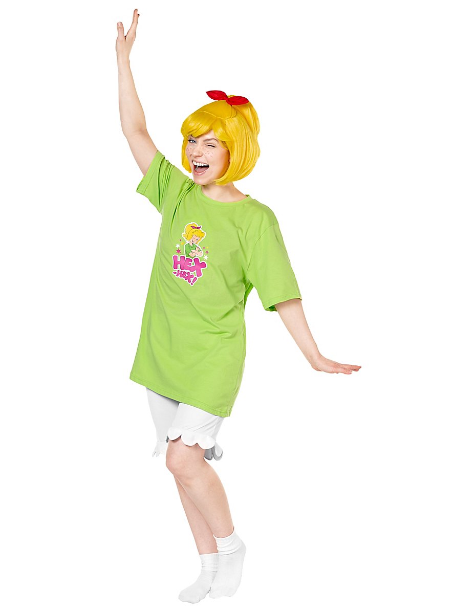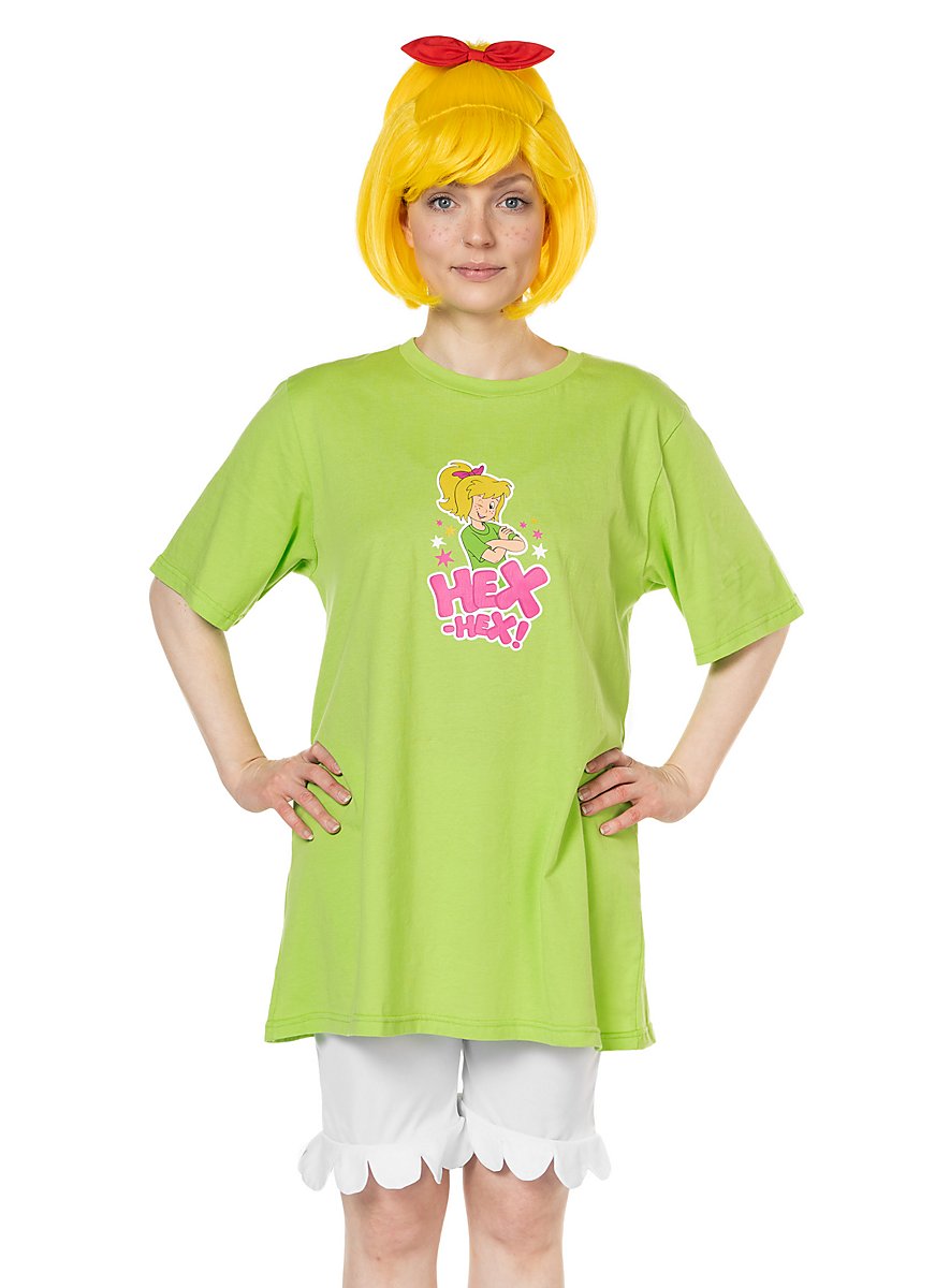 El disfraz consiste en una camiseta amplia en verde súper mágico de Bibi Blocksberg y unos pantalones cortos con volantes, ambos fabricados en 100% algodón. El estampado de gran formato en la parte delantera de la camiseta muestra a la pequeña bruja de Neustadt así como su típica expresión "HEX-HEX!". La camiseta no solo se puede llevar como parte de este disfraz, sino que naturalmente también se puede usar en el día a día como artículo de fan.