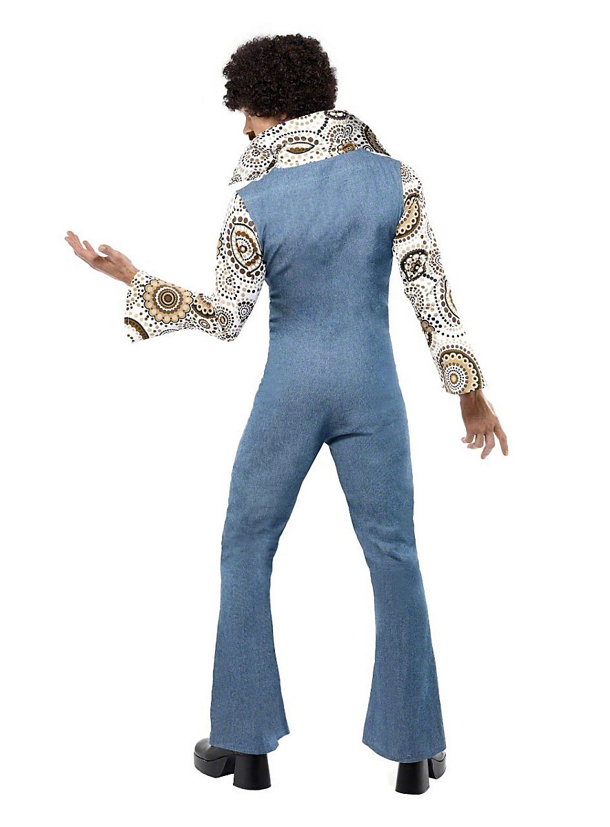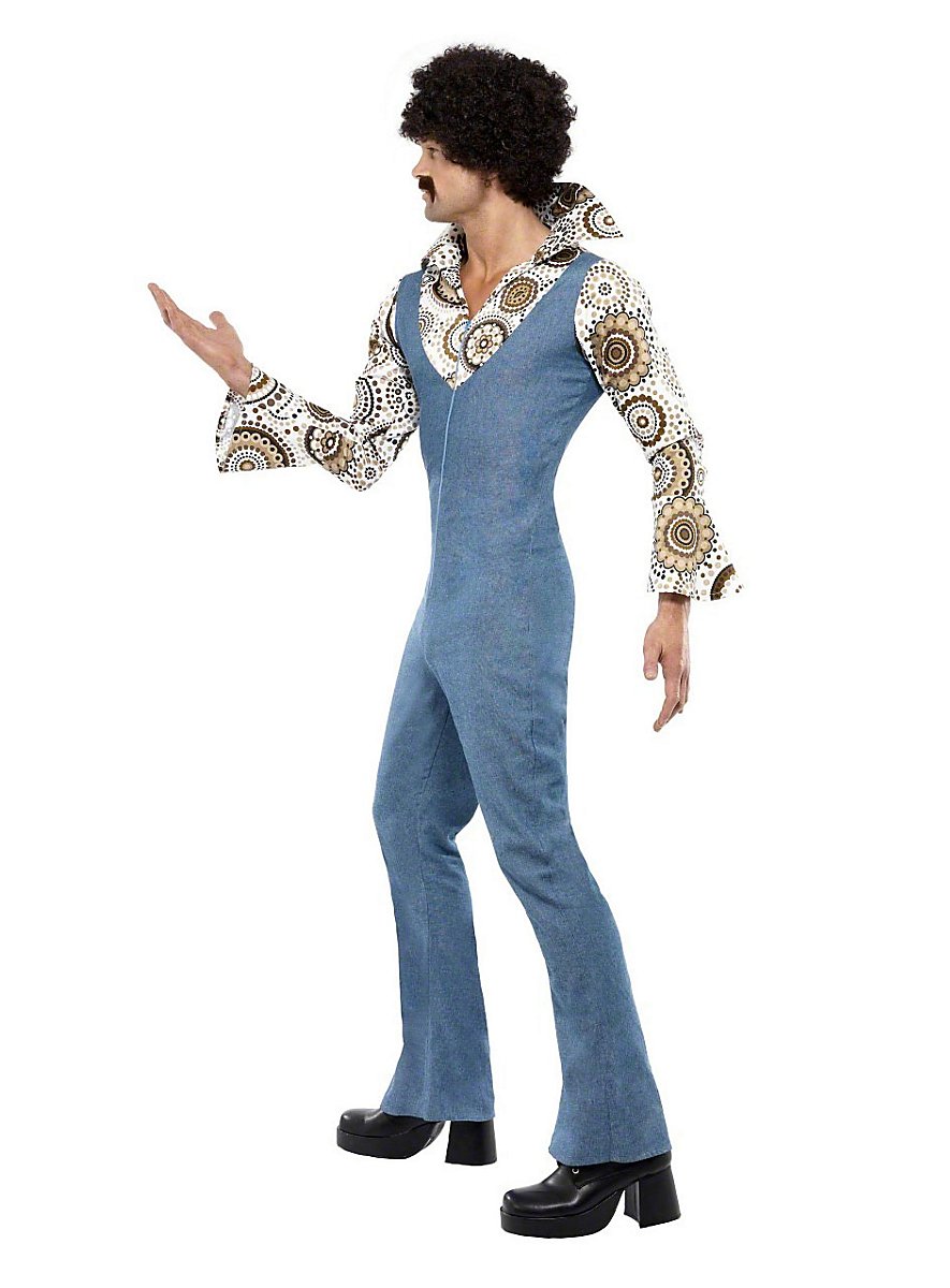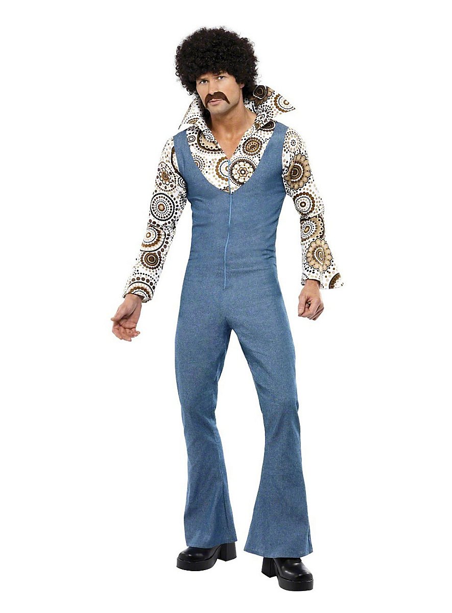¡Quien no puede quedarse quieto al escuchar discos de soul y siente felicidad al ver una bola de discoteca, debería echar un vistazo más de cerca a nuestro Disfraz de Machote Disco! El mono está cortado de tal manera que parece como si llevaras un peto ajustado sobre una camisa. Un auténtico estampado de los años 70 con flores marrones y círculos, mangas acampanadas y un cuello amplio hacen que la parte de la camisa sea una verdadera bomba disco. La parte del peto está hecha de tela azul gruesa. Una cremallera frontal facilita ponérselo y permite, según el gusto, mostrar el vello del pecho. Y para que las piernas te bailen bien mientras te mueves al ritmo, los pantalones son acampanados. ¡Four to the floor!