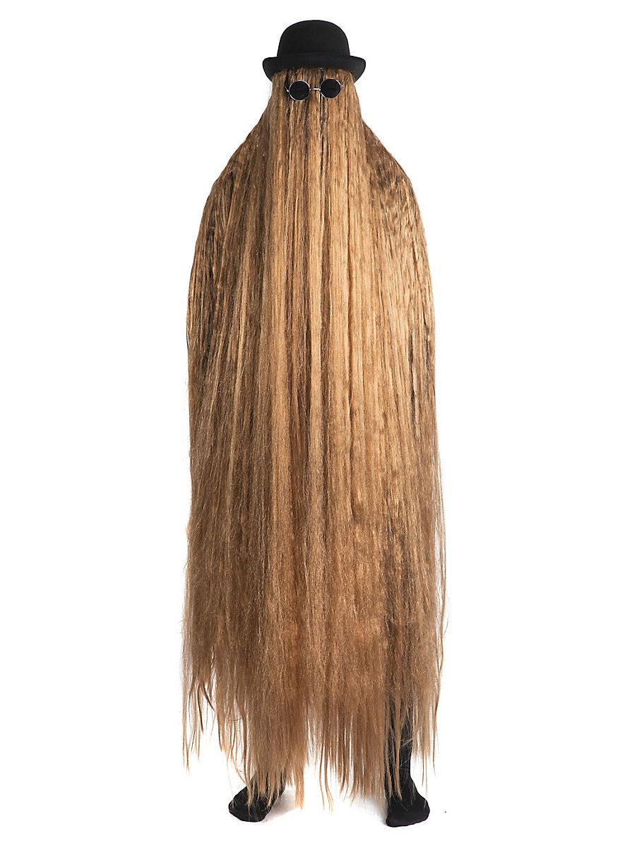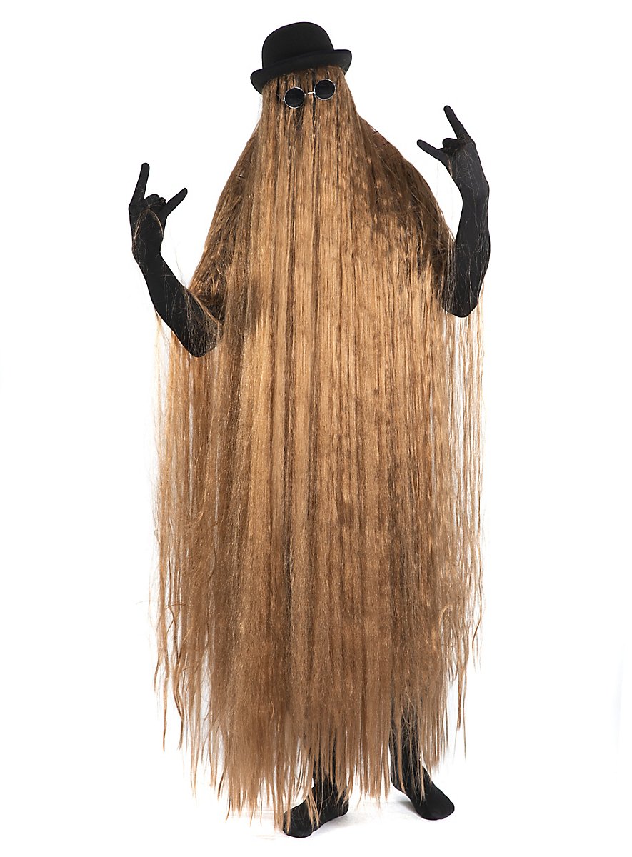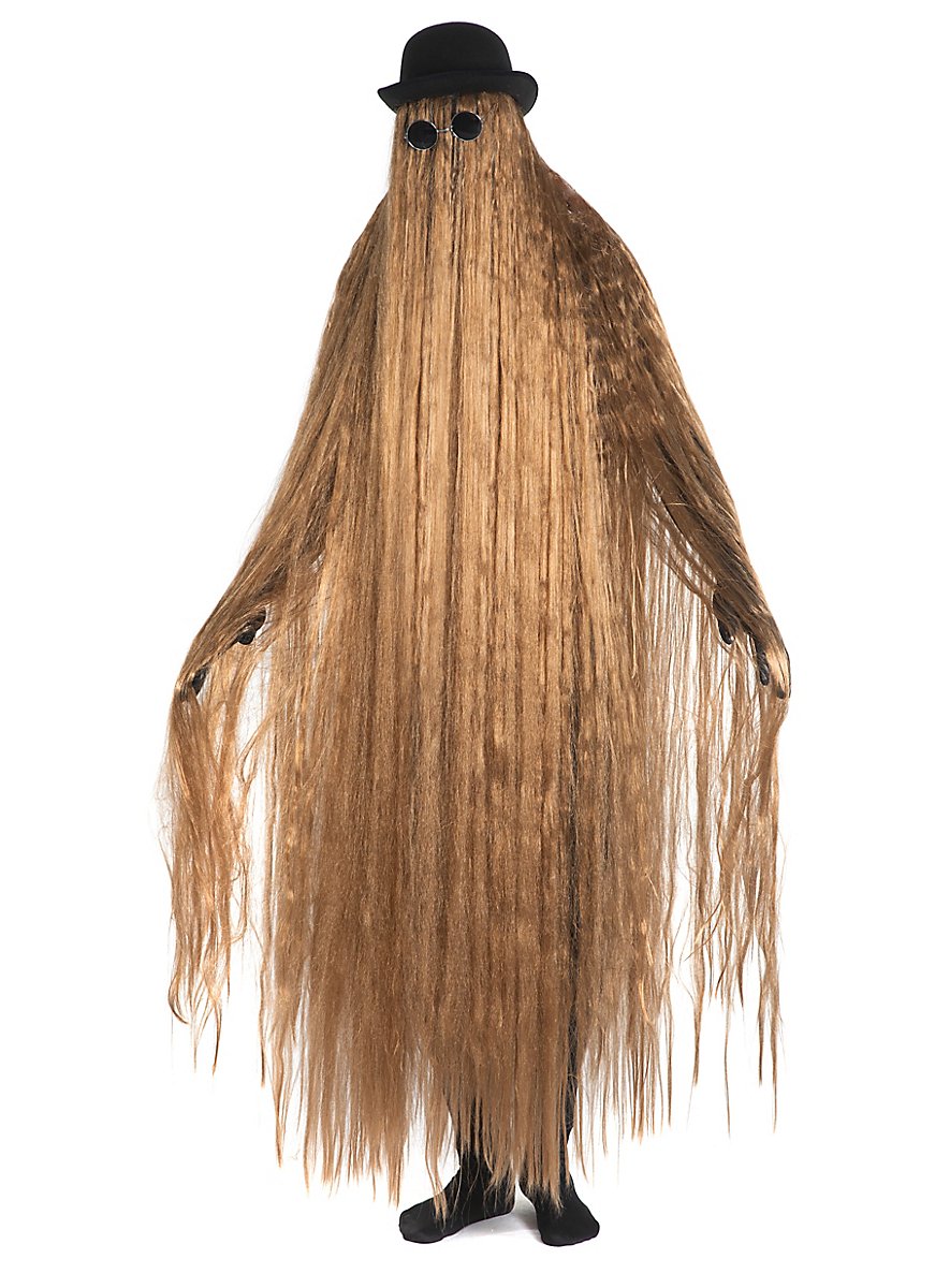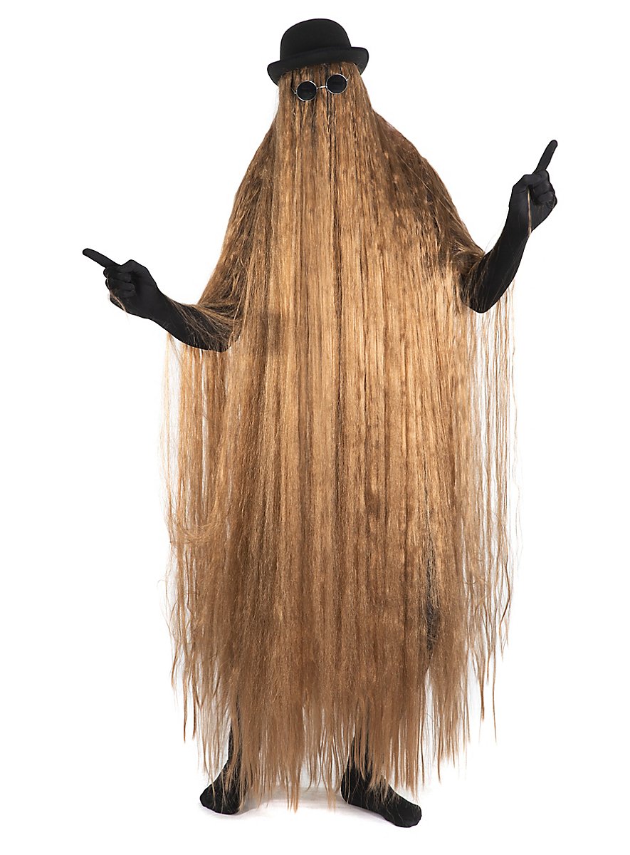 ¿Atraer todas las miradas y aun así permanecer irreconocible? Con este disfraz no hay problema. El traje peludo - que básicamente es una peluca de pelo largo extrema -, sombrero y gafas de sol despiertan inevitablemente recuerdos del pariente del campo que visita a una familia excéntrica vestida de negro en una comedia siniestra.