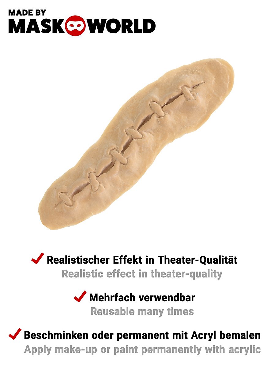 Con esta aplicación profesional de látex Cosida Toscamente puedes transformarte fácil y rápidamente en una víctima de accidente de terror o en cualquier otro personaje de tu imaginación. Como todos los productos Maskworld, este set de Costura Tosca también está sujeto a los más estrictos controles de calidad para cumplir con los estándares de un resultado de transformación profesional. Todas las aplicaciones de látex maskworld están hechas a mano. El látex se caracteriza por su extrema elasticidad y resistencia. Debido a esta propiedad, las aplicaciones ofrecen un alto confort de uso y un efecto especialmente realista incluso con uso frecuente. El pegamento mastix se caracteriza por su excelente poder adhesivo y óptima compatibilidad con la piel.