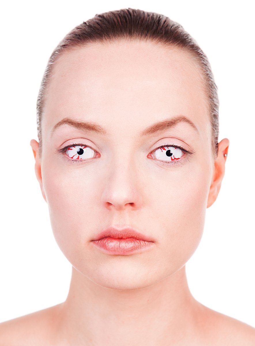 Ojos completamente blancos y rastros de sangre siniestros – ¡con nuestras lentillas esclera manchas de sangre convertís vuestros ojos en el punto culminante perturbador de vuestro disfraz de Halloween, fantasía u horror!