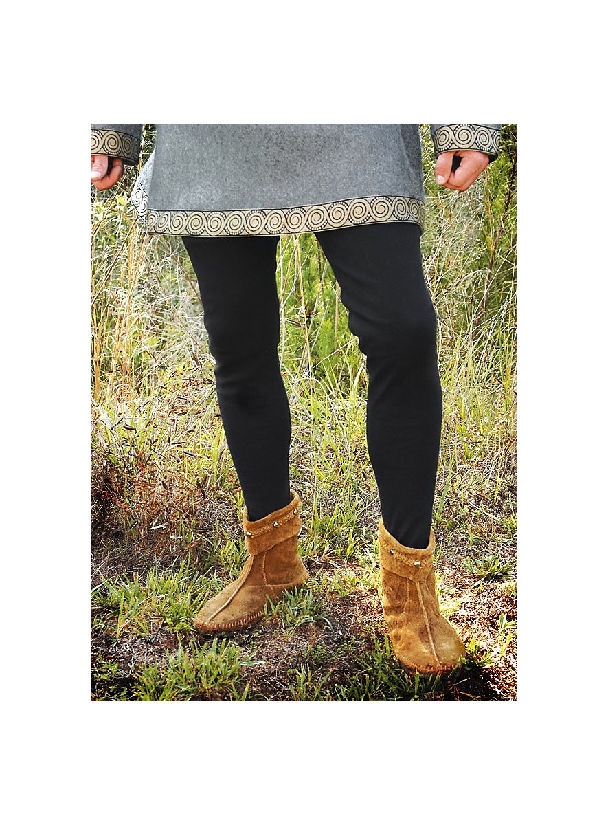 Los pantalones, más conocidos como medias-pantalón, existen desde principios del siglo XV. Anteriormente, la gente solía llevar calzas separadas, aunque en algunos casos ya se cosían medias y pantalones juntos mucho antes. Nuestros pantalones medievales negros están confeccionados en algodón puro elástico, que es suave y especialmente cómodo de llevar. Una banda elástica en la cintura garantiza un ajuste seguro de los pantalones medievales, y en los extremos de las perneras hay una presilla que reemplaza el pie más ancho obligatorio de las medias-pantalón y evita que los pantalones se suban. ¡Una prenda extremadamente cómoda!