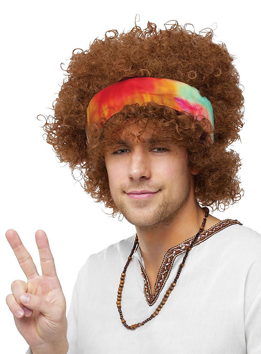 Mantente siempre florido. Peluca afro imponente con innumerables rizos y ondas. Una colorida cinta batik para la cabeza le da a la peluca hippie un fantástico toque de los años 70.